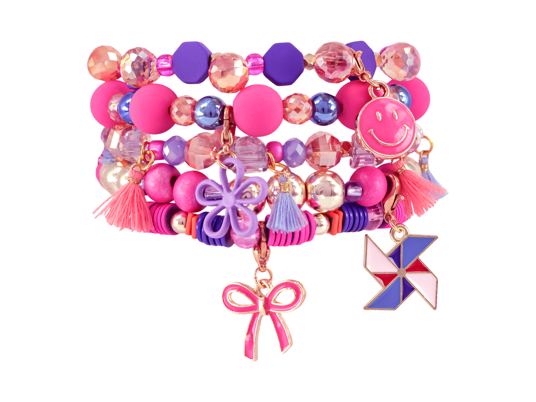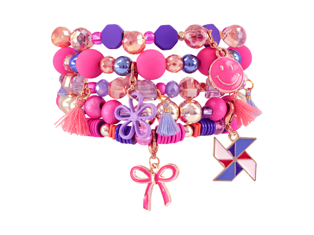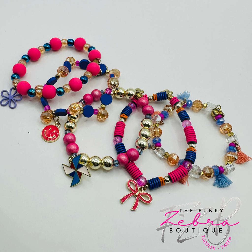 The Gem Jams (KIDS) Blue Moon Stack is made up of fun blue, pink and purple colored bracelets! All stretch and all synthetic stones.