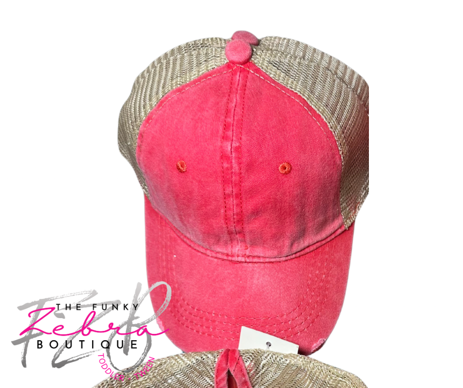 Kids Girls High Ponytail Coral Red Baseball Hat with Beige Mesh Fits Ages 3T-7/8