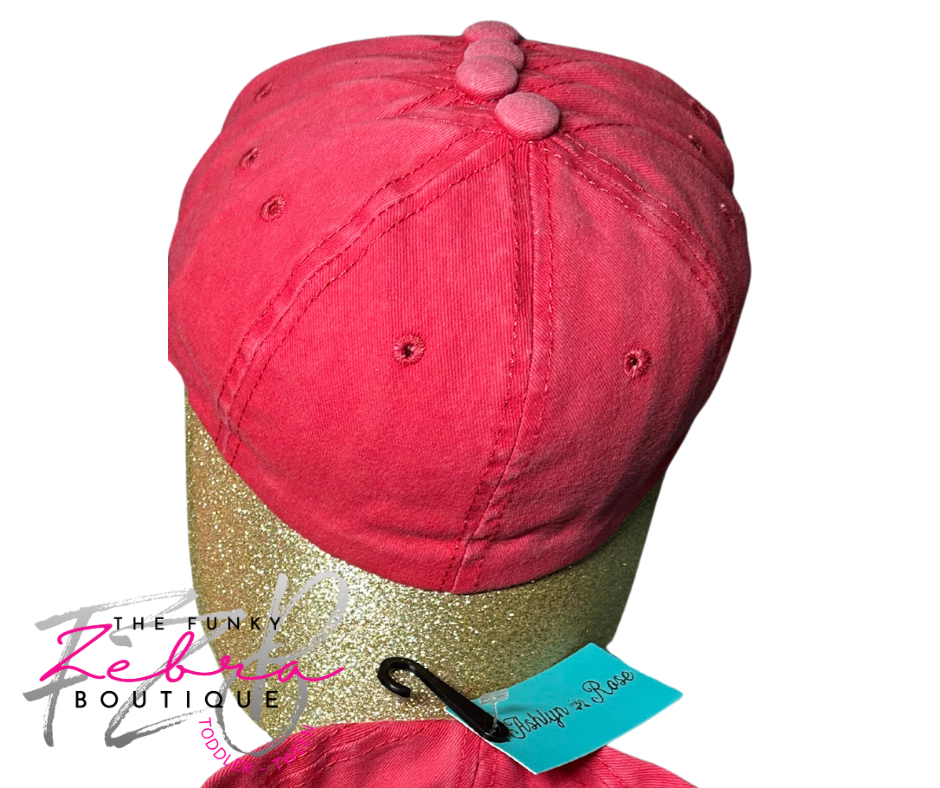 Kids Girls Coral Red Gold Glitter Bill Baseball Hat Fits 3T-7/8