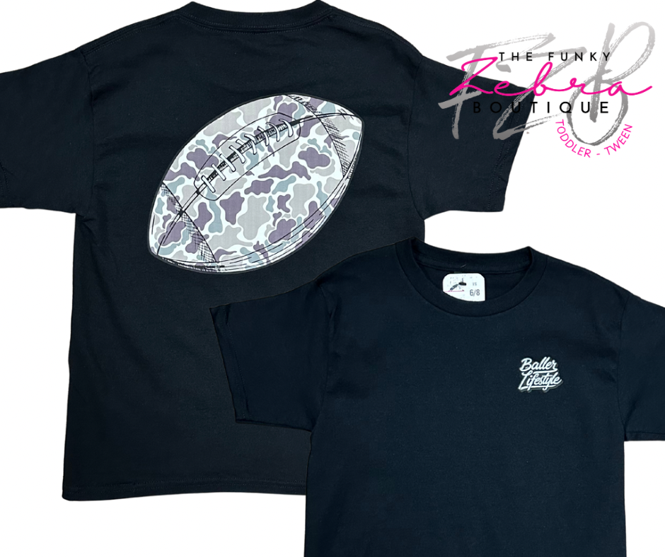 Baller Lifestyle Camo Camouflage Football Drip Black Tee Size 4/6-18/20