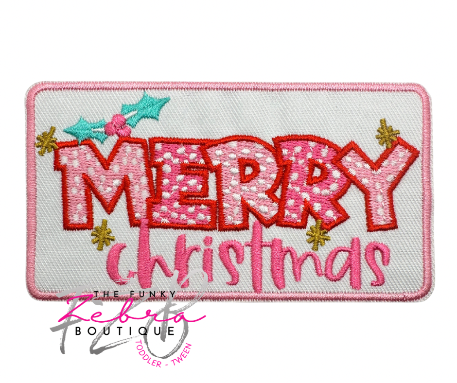 Christmas Merry and Bright Pink Embroidered Iron On Patch