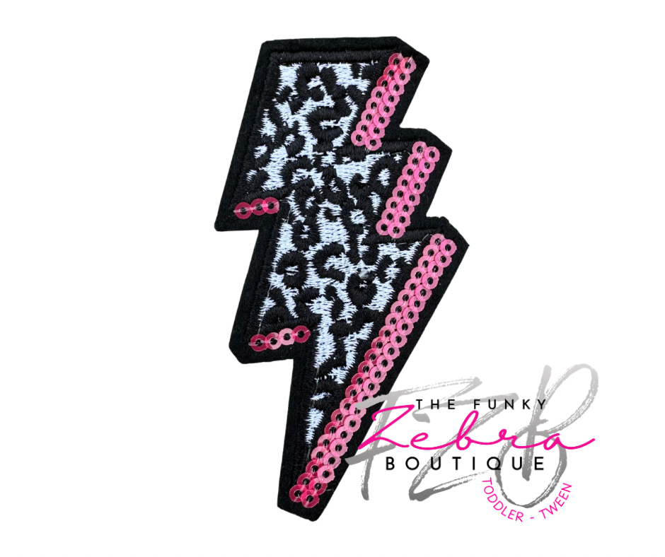 Designer Leopard Print Lightning Bolt Pink & Black Sequin Embroidered Iron On Patch