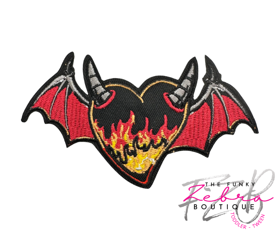 Flaming Bat Heart Embroidered Iron On Patch