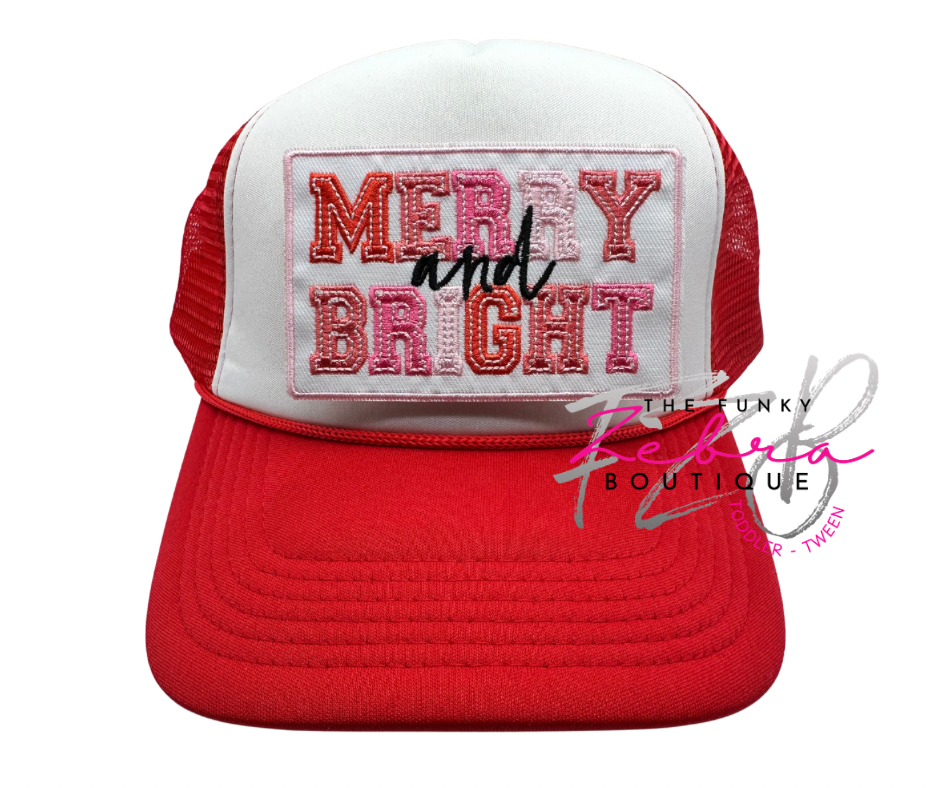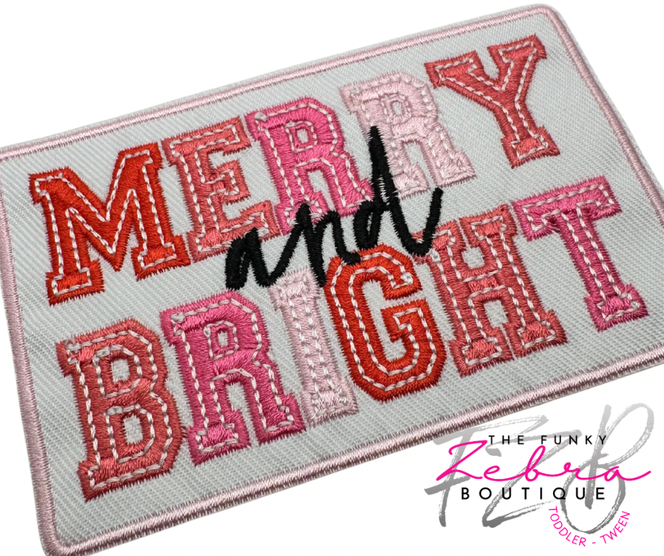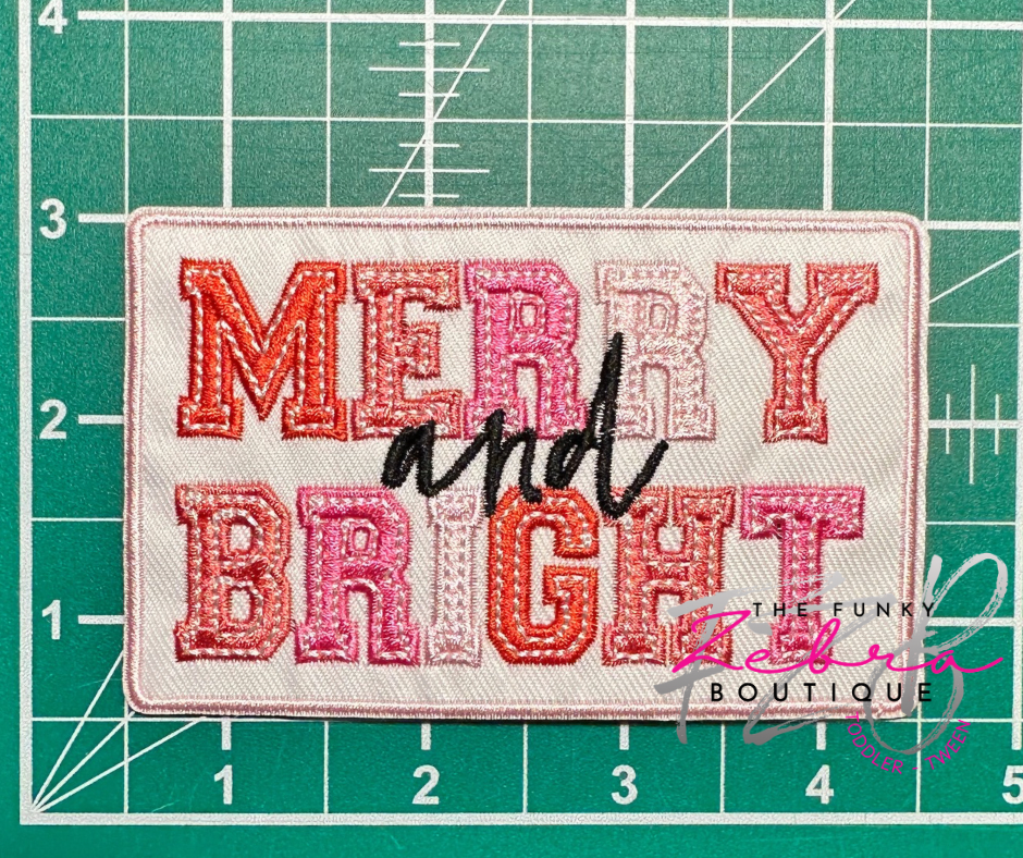 Shades of Pink Merry and Bright embroidered iron on patch.
