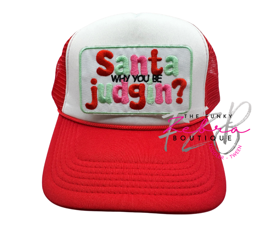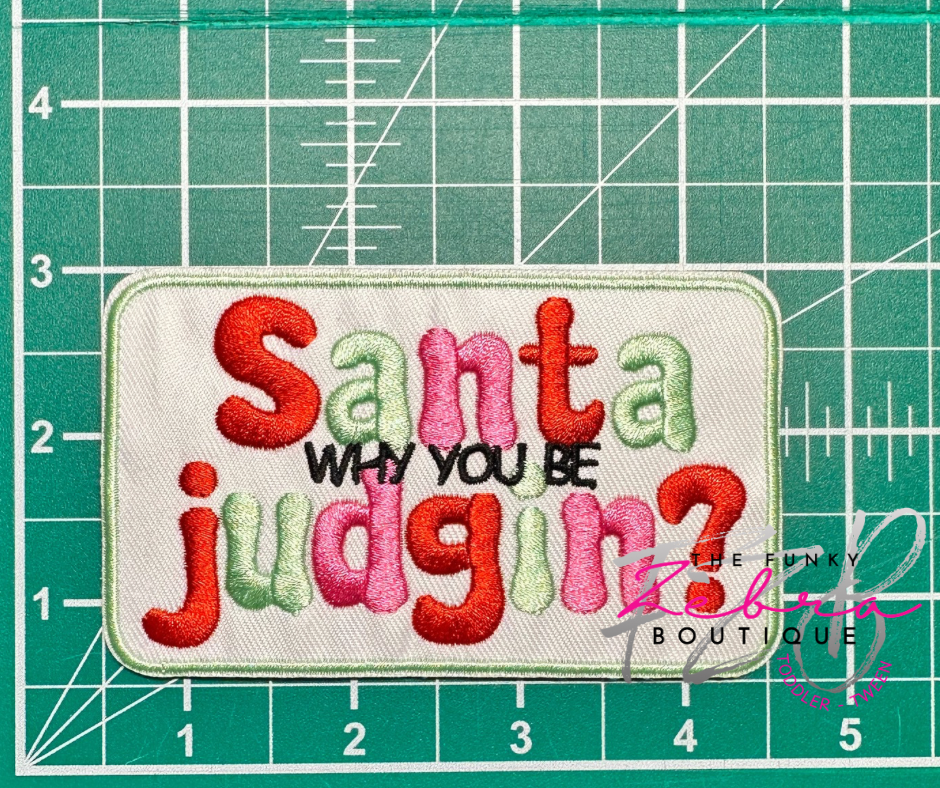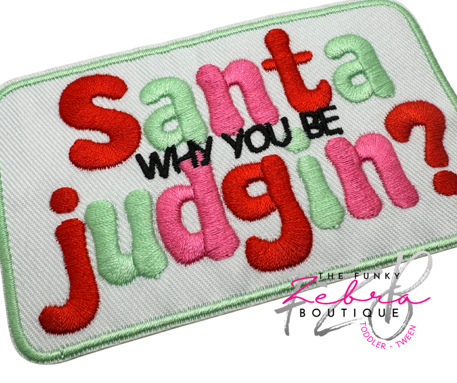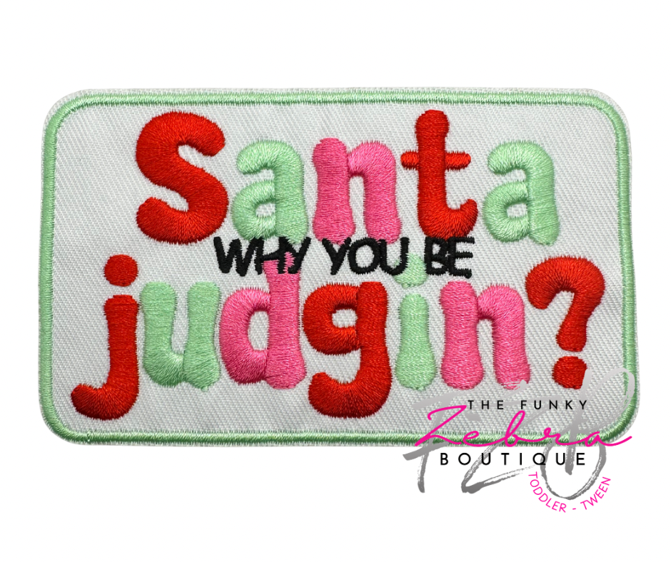 Mint Green, pink & red Santa Why You Be Judgin? embroidered iron on patch.