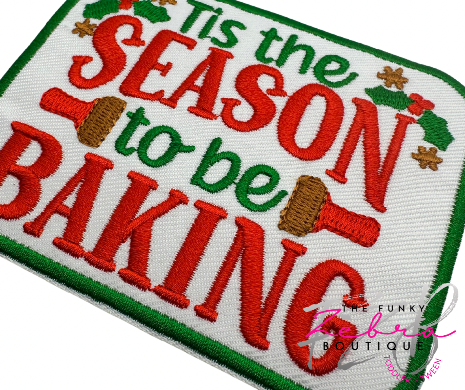 Green & red Tis The Season to be Baking embroidered iron on patch.