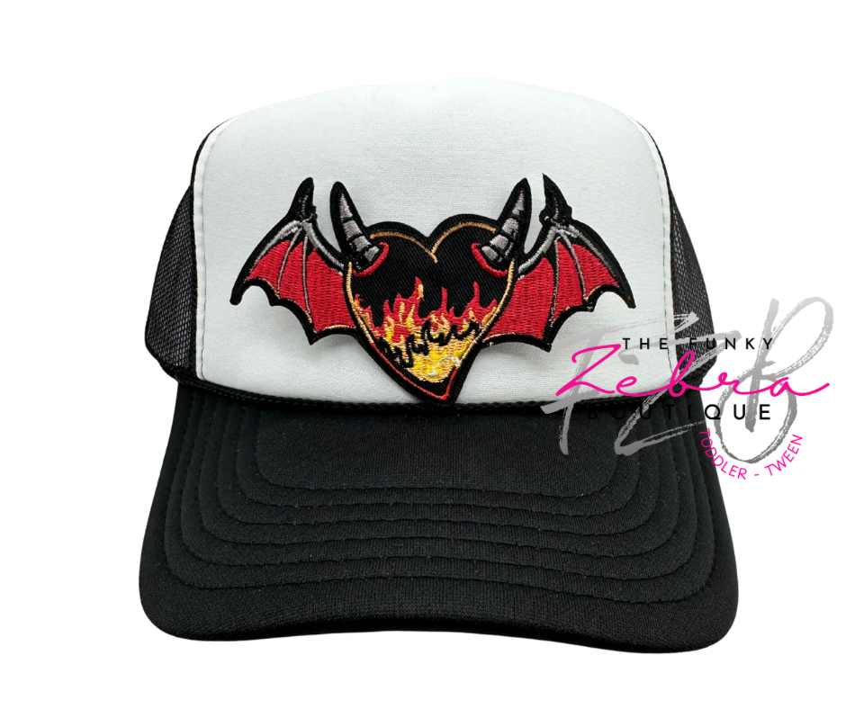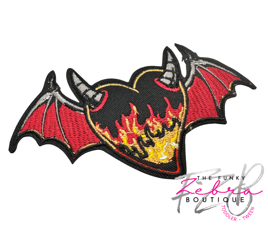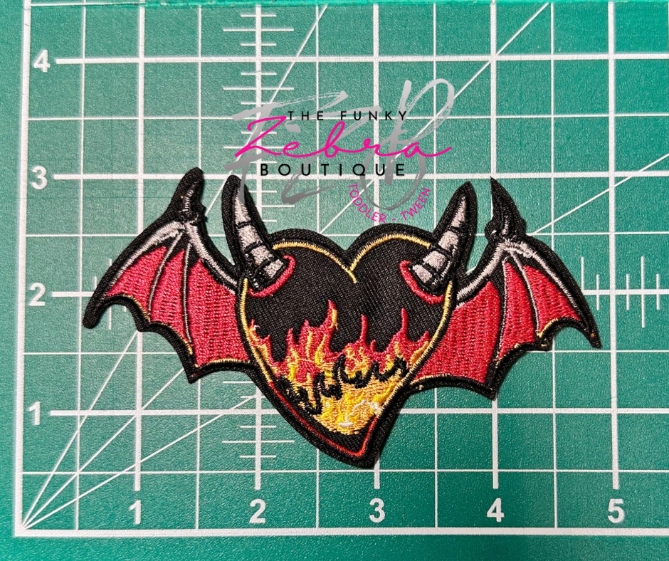 This sassy flaming bat heart patch features a black background with grey, orange and red thread.