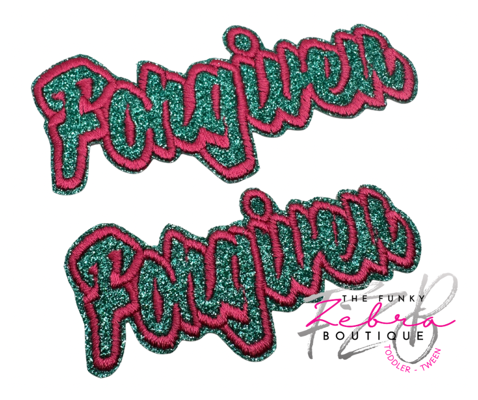 A two tone high quality embroidered patch with a jade turquoise glitter base and contrasting hot pink thread. Iron on adhesive on the back.Β Can be sewn or ironed onto polyester or cotton. Wash cold, dry on no-heat.