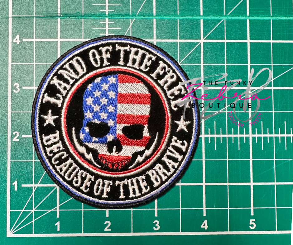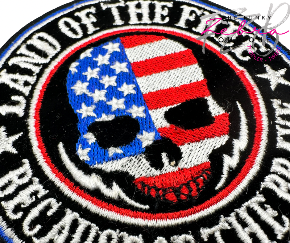 Featuring a heat- sealed backing. This means that the patch may be ironed on or sewn on to most clothing easily. Red, white and blue thread with black velvet background.