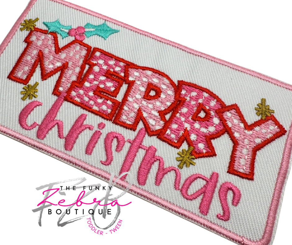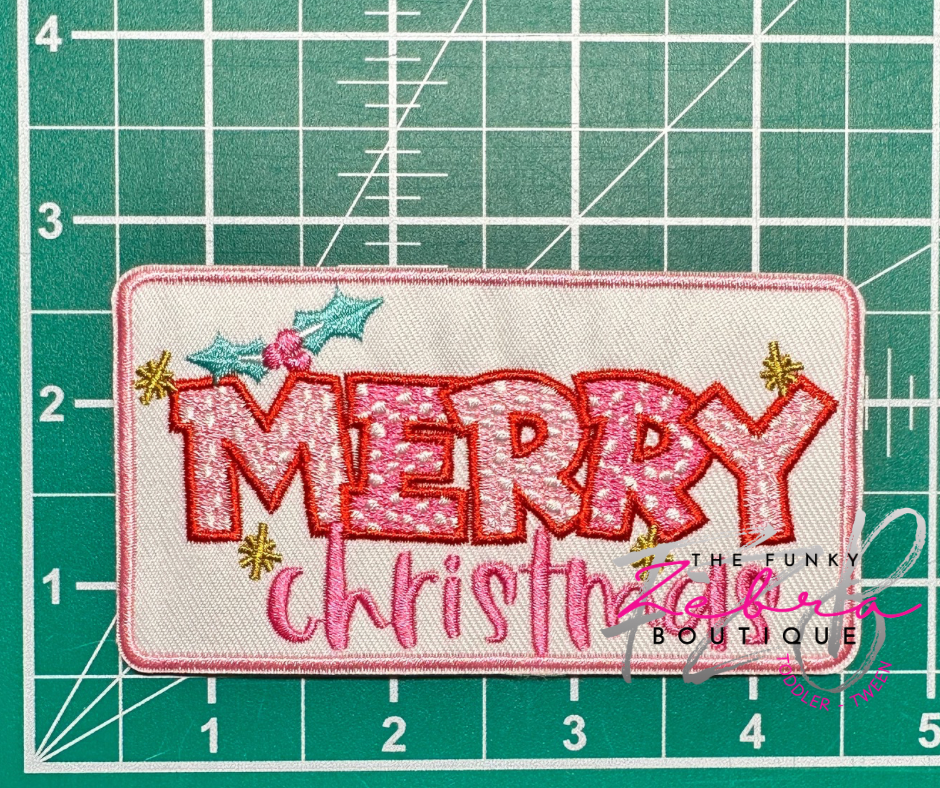 Shades of Pink Merry Christmas embroidered iron on patch.