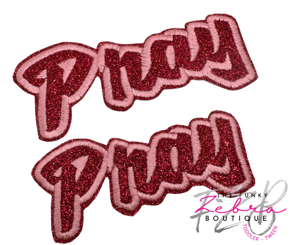 A two tone high quality embroidered patch with a cherry pink glitter base and contrasting candy pink thread. Iron on adhesive on the back.Β Can be sewn or ironed onto polyester or cotton. Wash cold, dry on no-heat.
