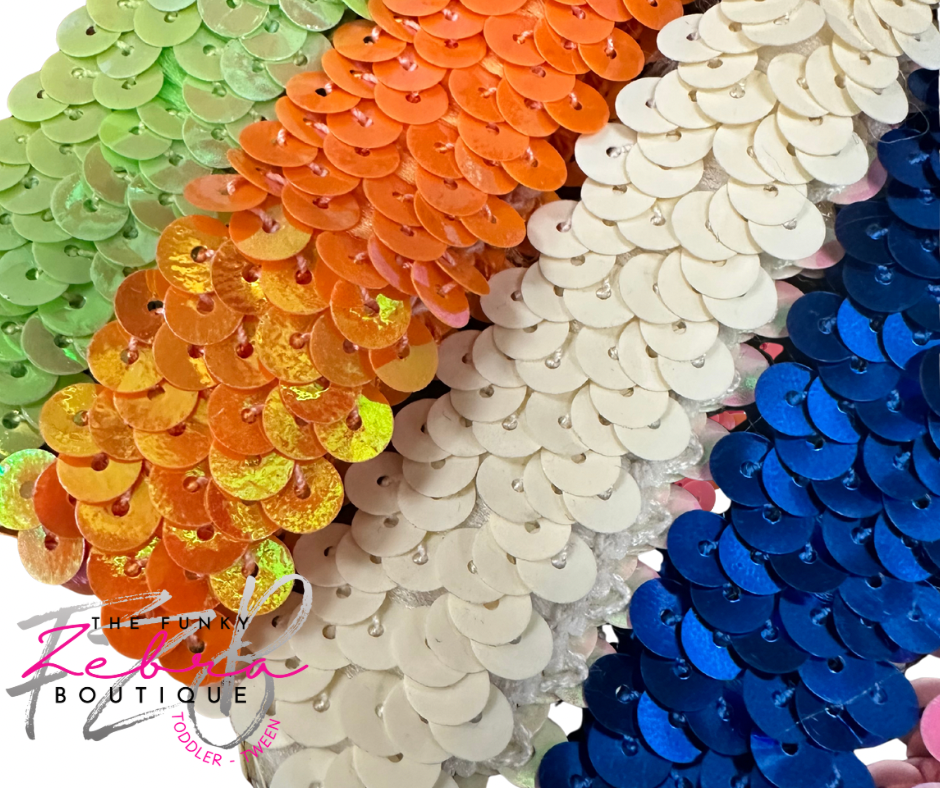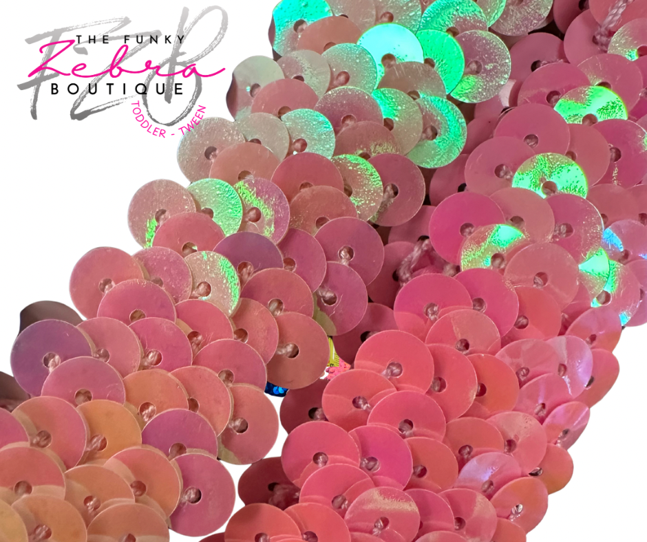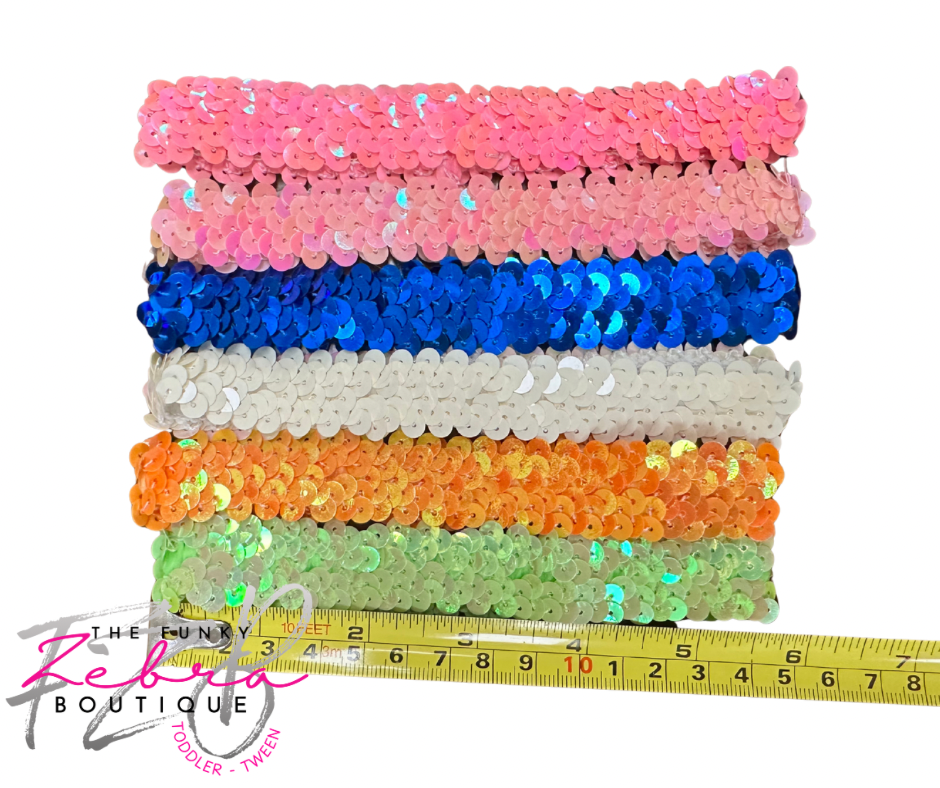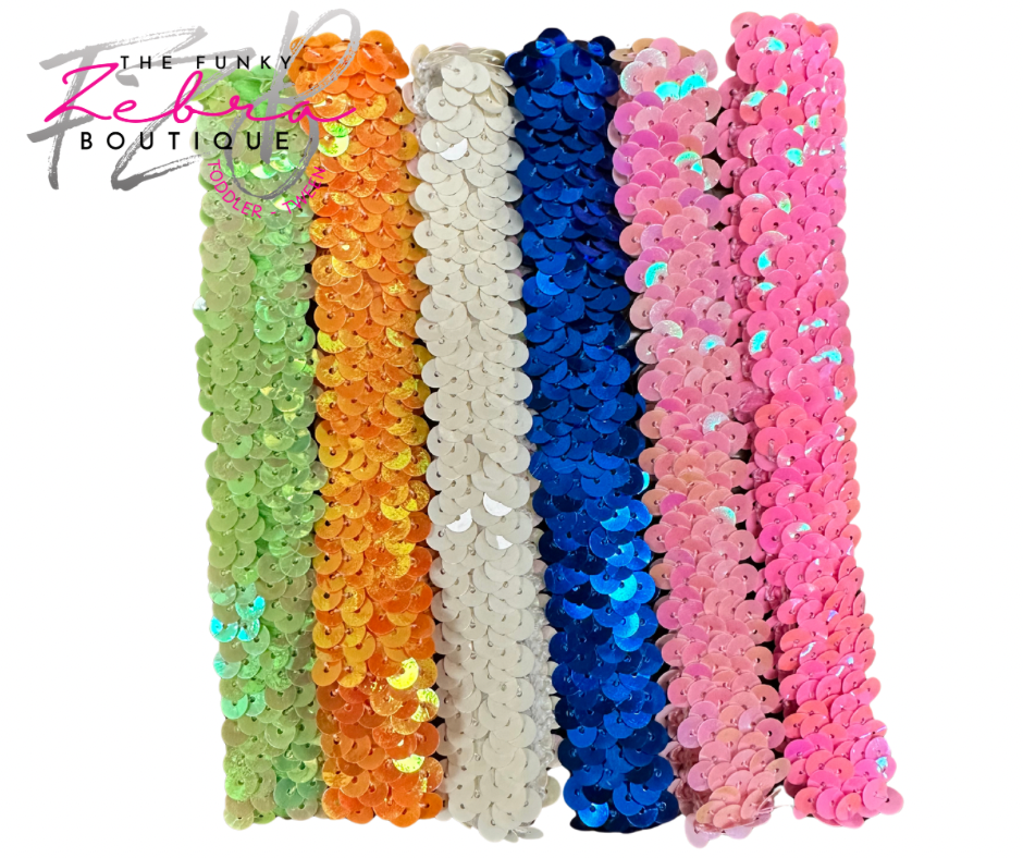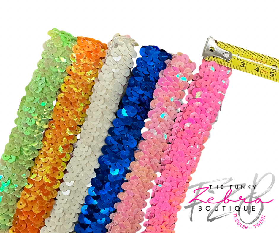 Our Sequin Headband is approx. 6 x .75 inches and is made up of sequin and elastic. The elastic stretches for a cozy fit. Best fitting kids through adults. Wear as is or add a small bow to jazz it up.