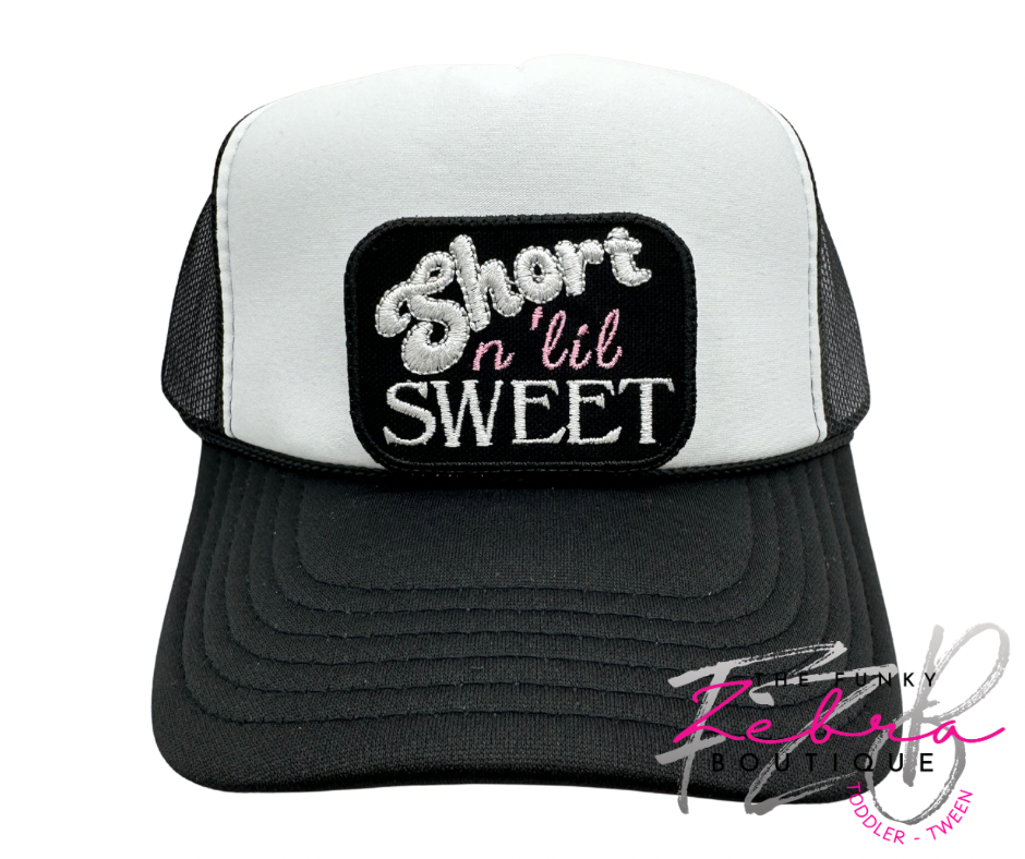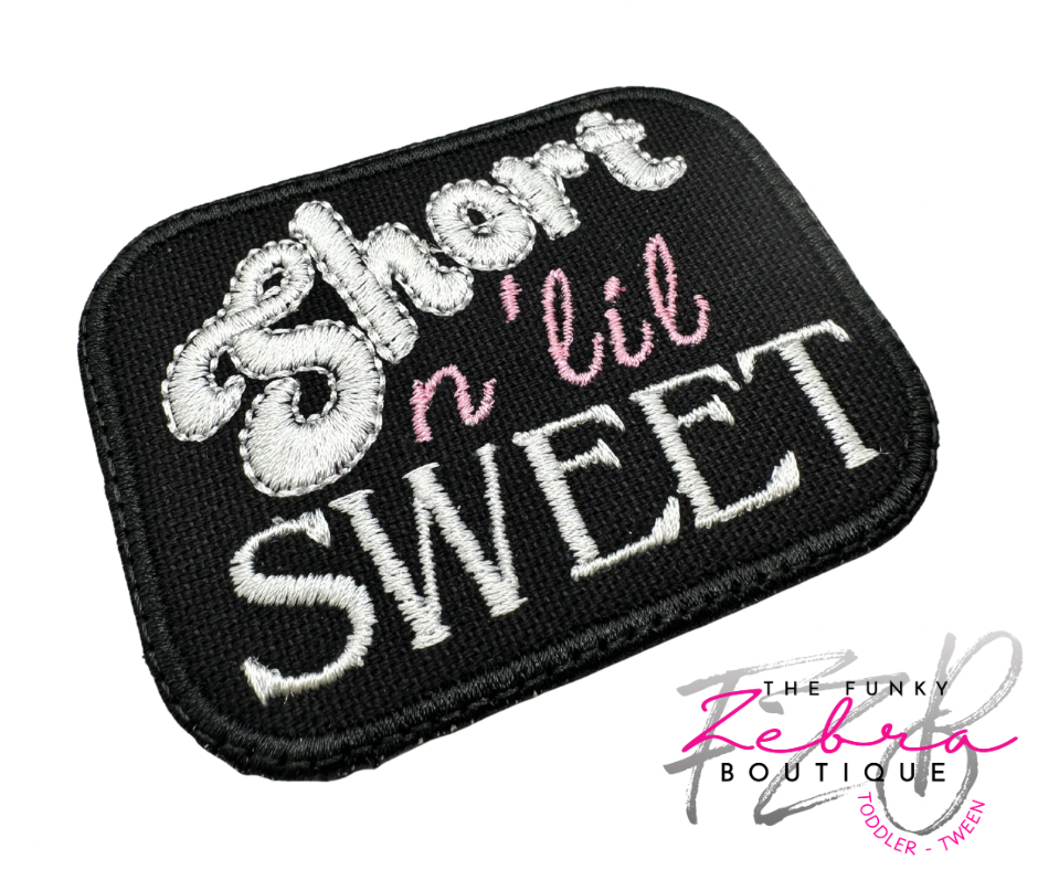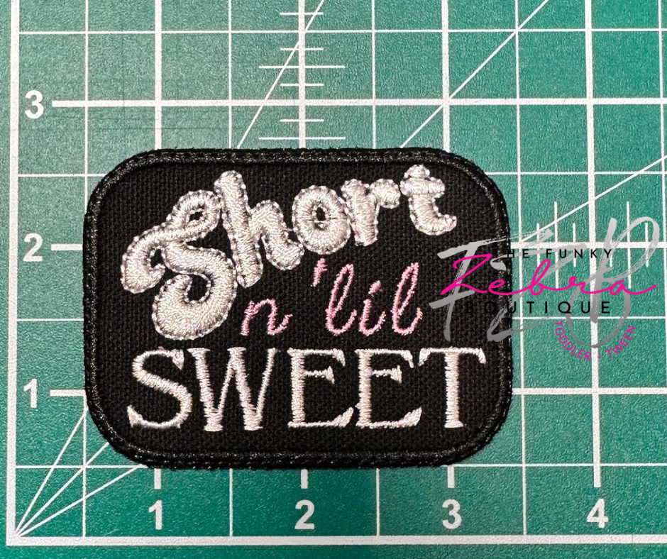 So fun.....fun size. This Short n 'lil sweet patch has a black background with white and pink thread.