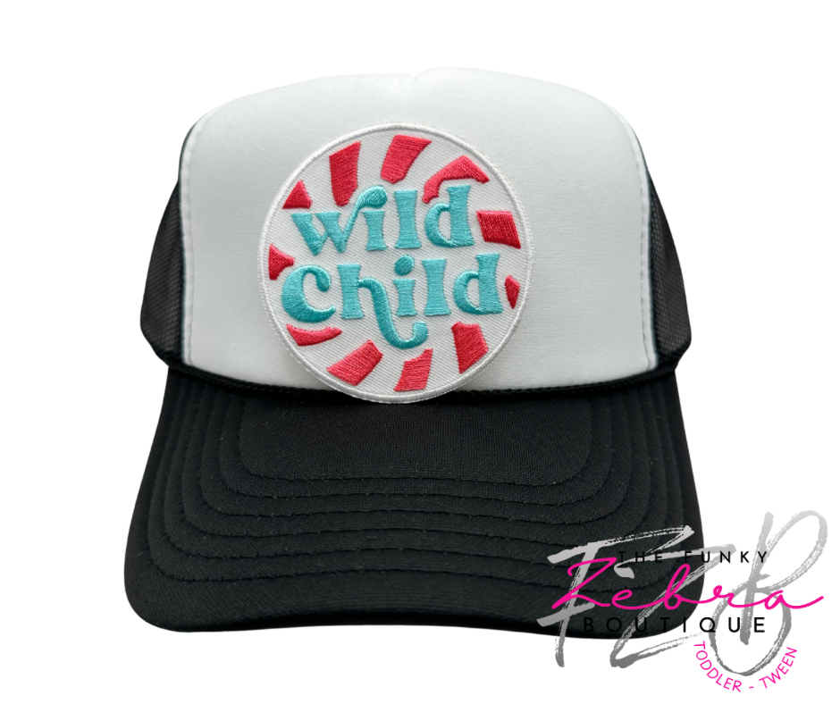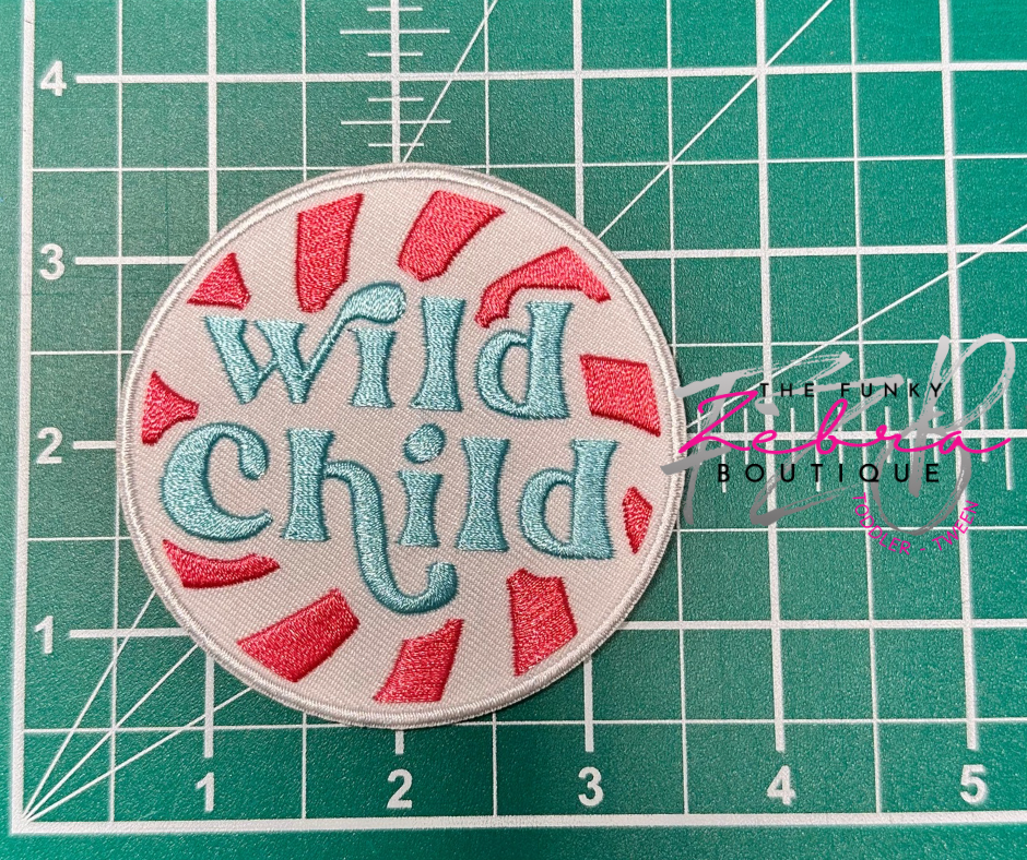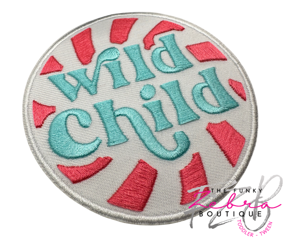 This designer Wild Child patch features a white background with sky blue and coral/pink thread.