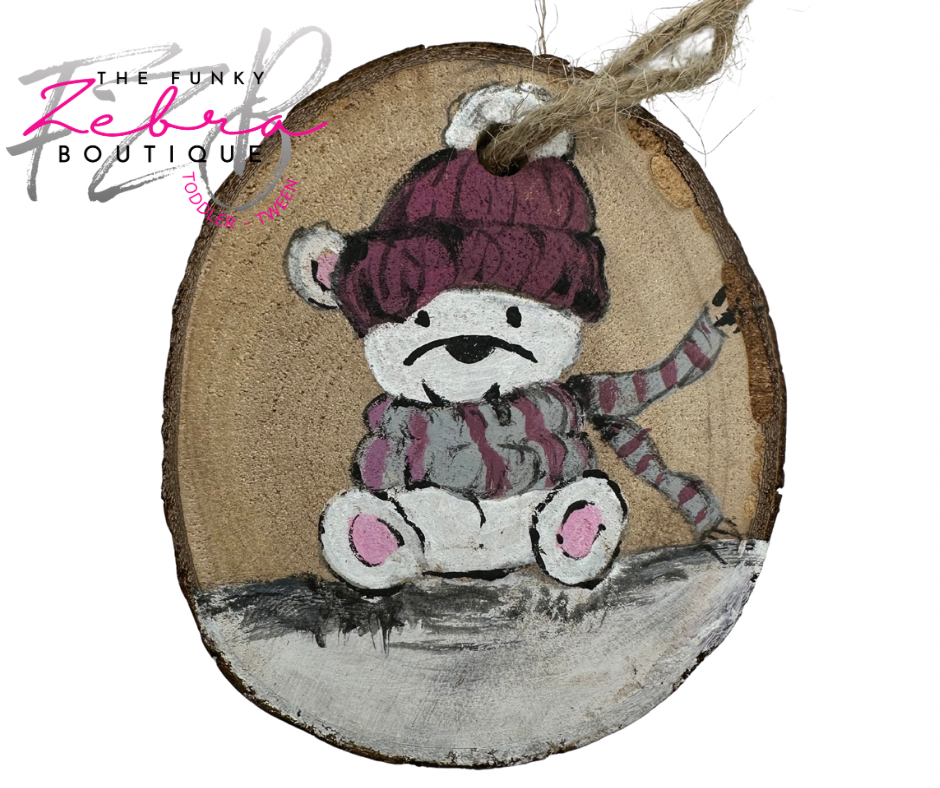 Christmas Bear with Purple Pink Beanie Hand Painted Wood Ornament