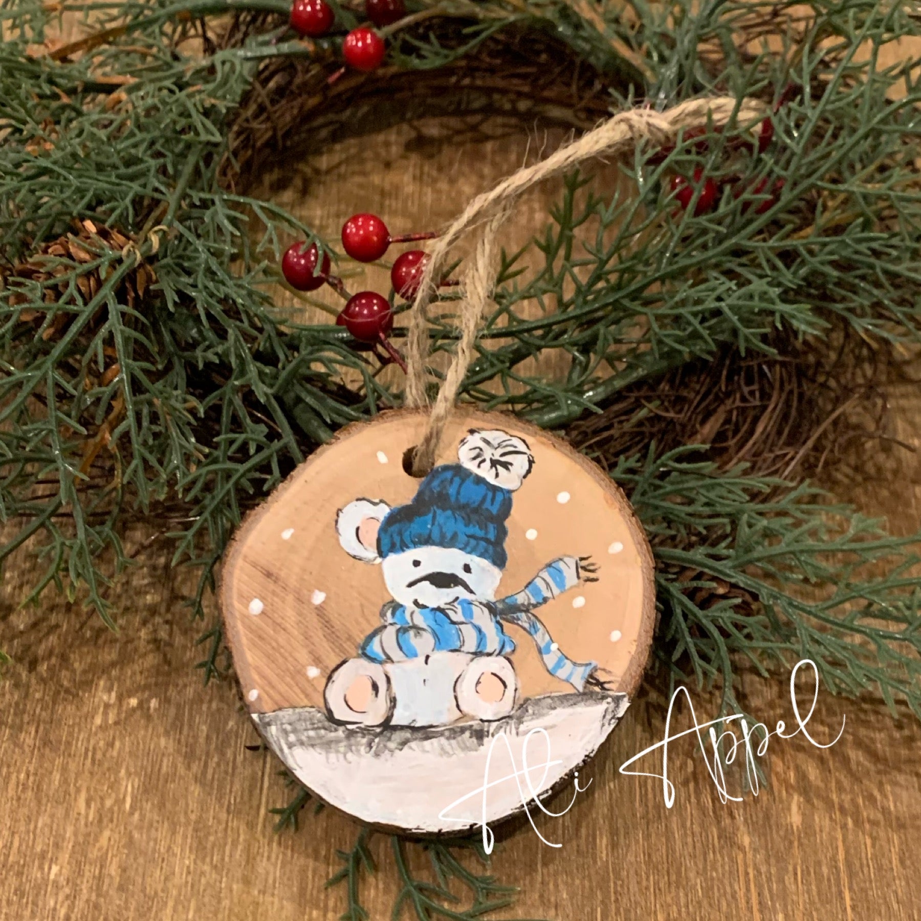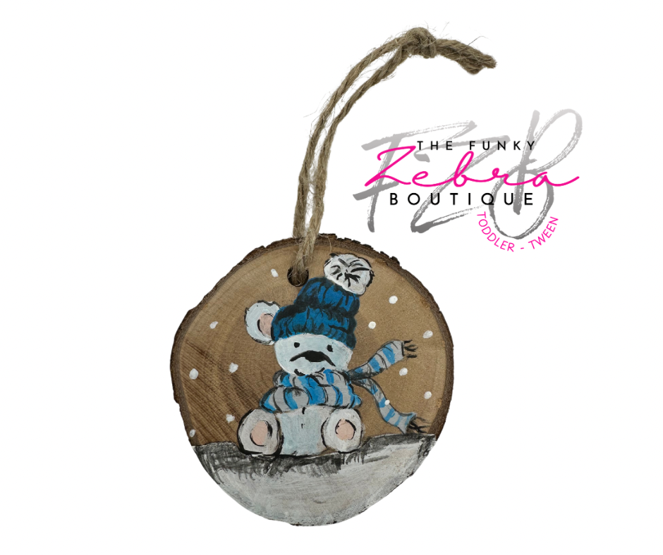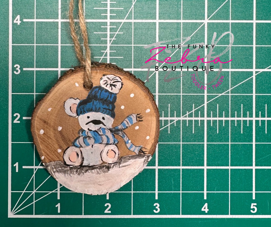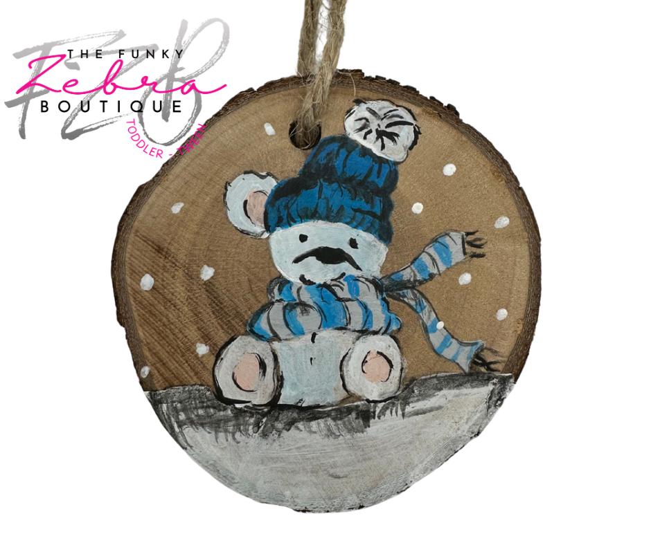 Christmas Bear with Blue Beanie Hand Painted Wood Ornament