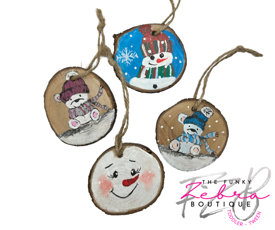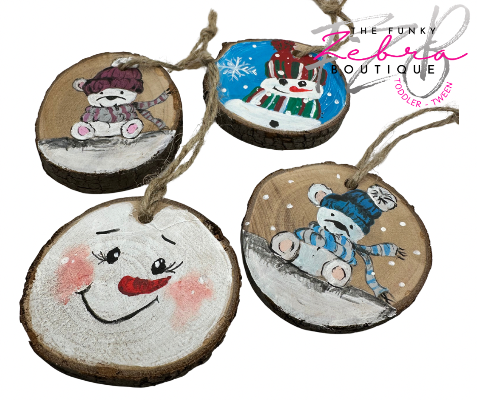The most unique gift you can give. These locally sourced wood ornaments are all hand made! From the cut wood slices with raw bark edges to the hand painted design, each ornament is one of a kind.Β