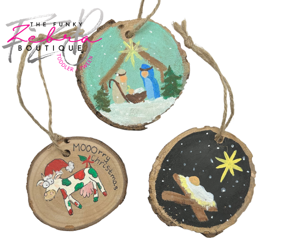 The most unique gift you can give. These locally sourced wood ornaments are all hand made! From the cut wood slices with raw bark edges to the hand painted design, each ornament is one of a kind.Β