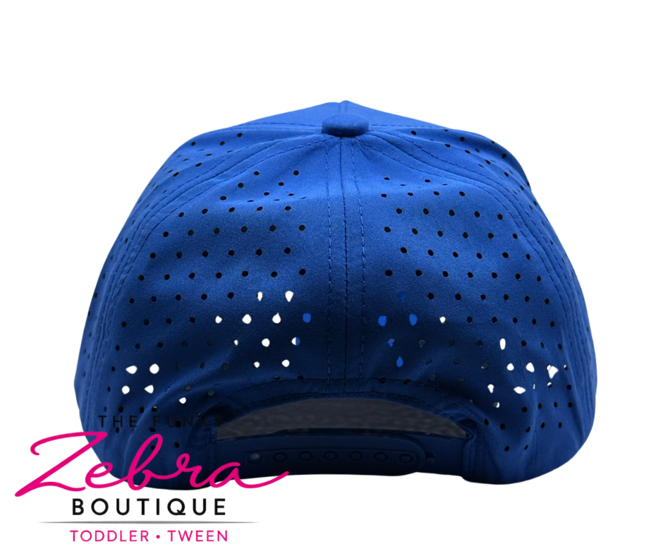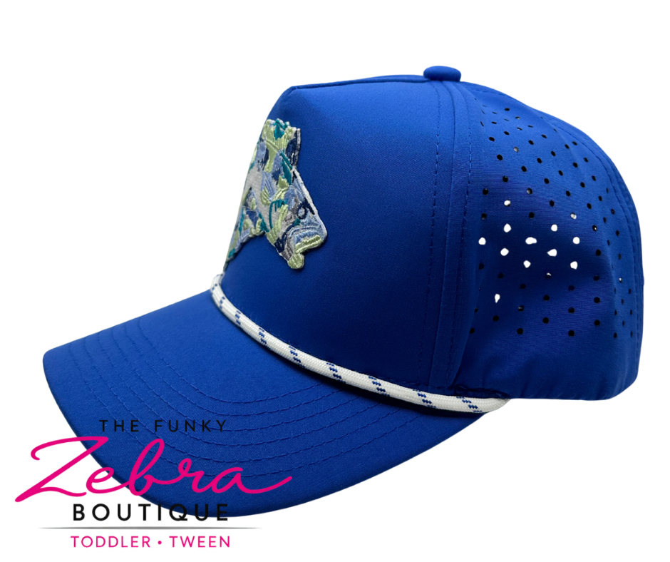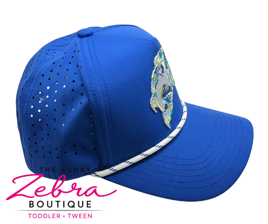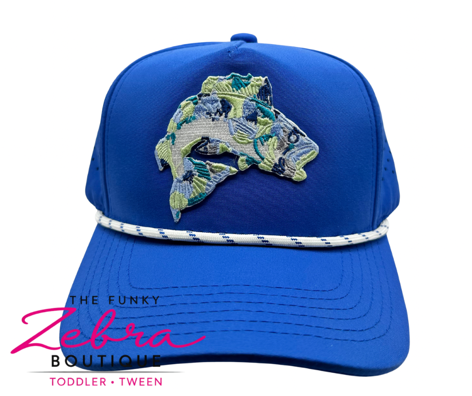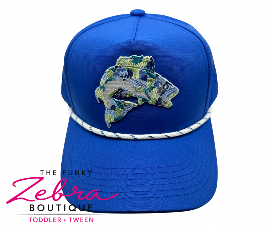 This hat is a bright royal blue performance-style snapback with a clean, structured crown and a gently curved bill. The standout detail is the embroidered fish patch on the frontβstitched in layered shades of blue, teal, sage, and light green for a textured, almost camo-inspired look that gives it depth and movement.