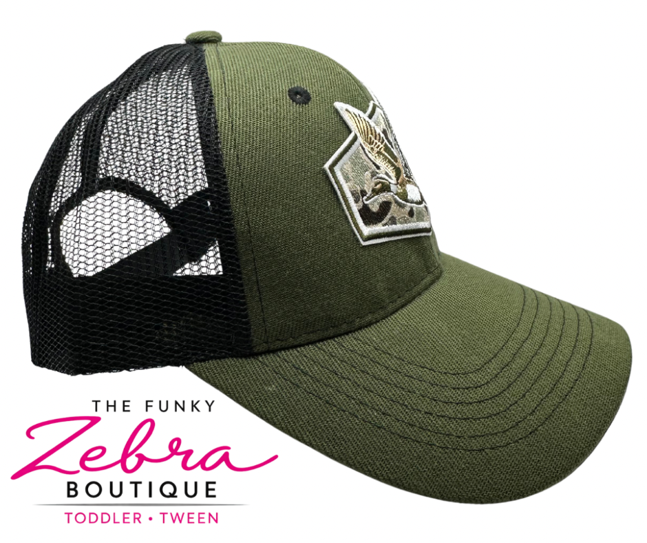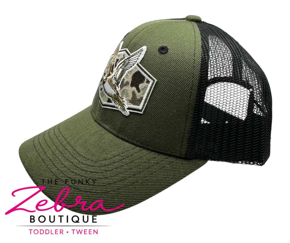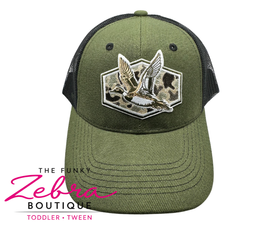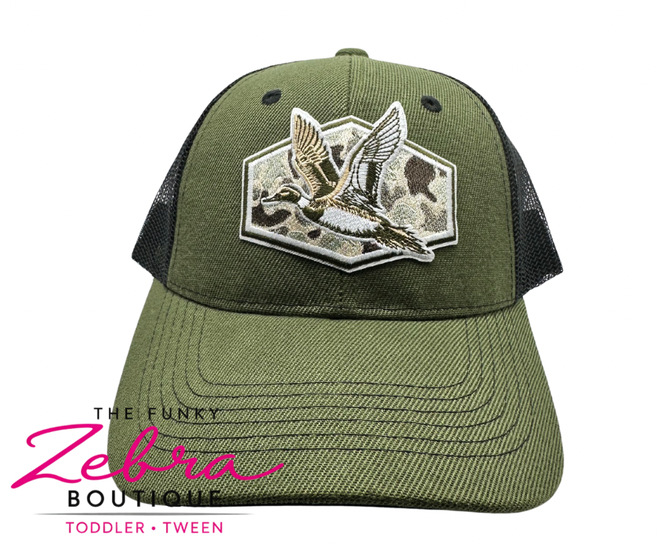 The focal point is the embroidered duck patch on the front, set inside a subtle hexagon-shaped border with a camo-inspired background. The duck is stitched in layered neutralsβcream, tan, brown, and oliveβcreating a realistic, in-flight look that pops against the green base.