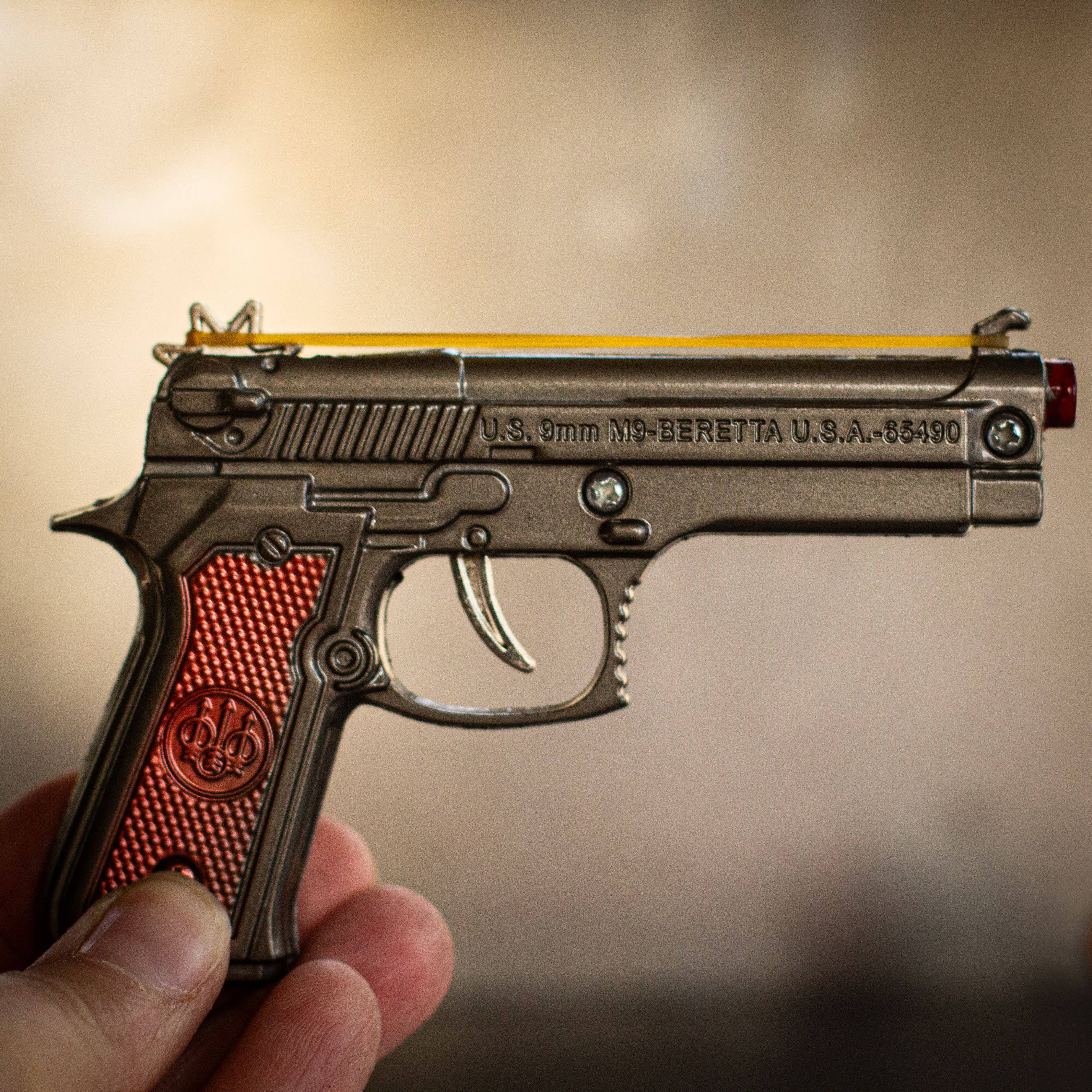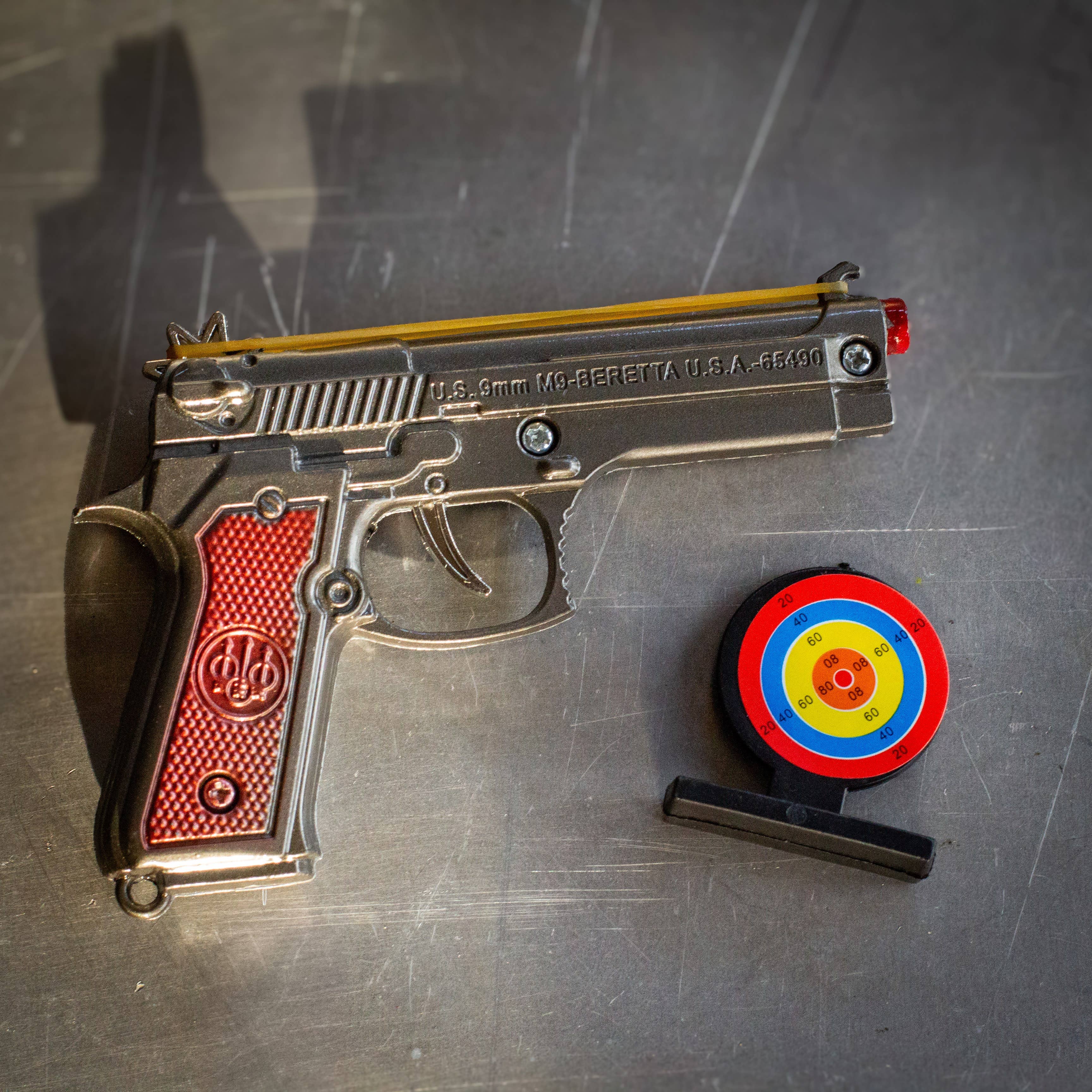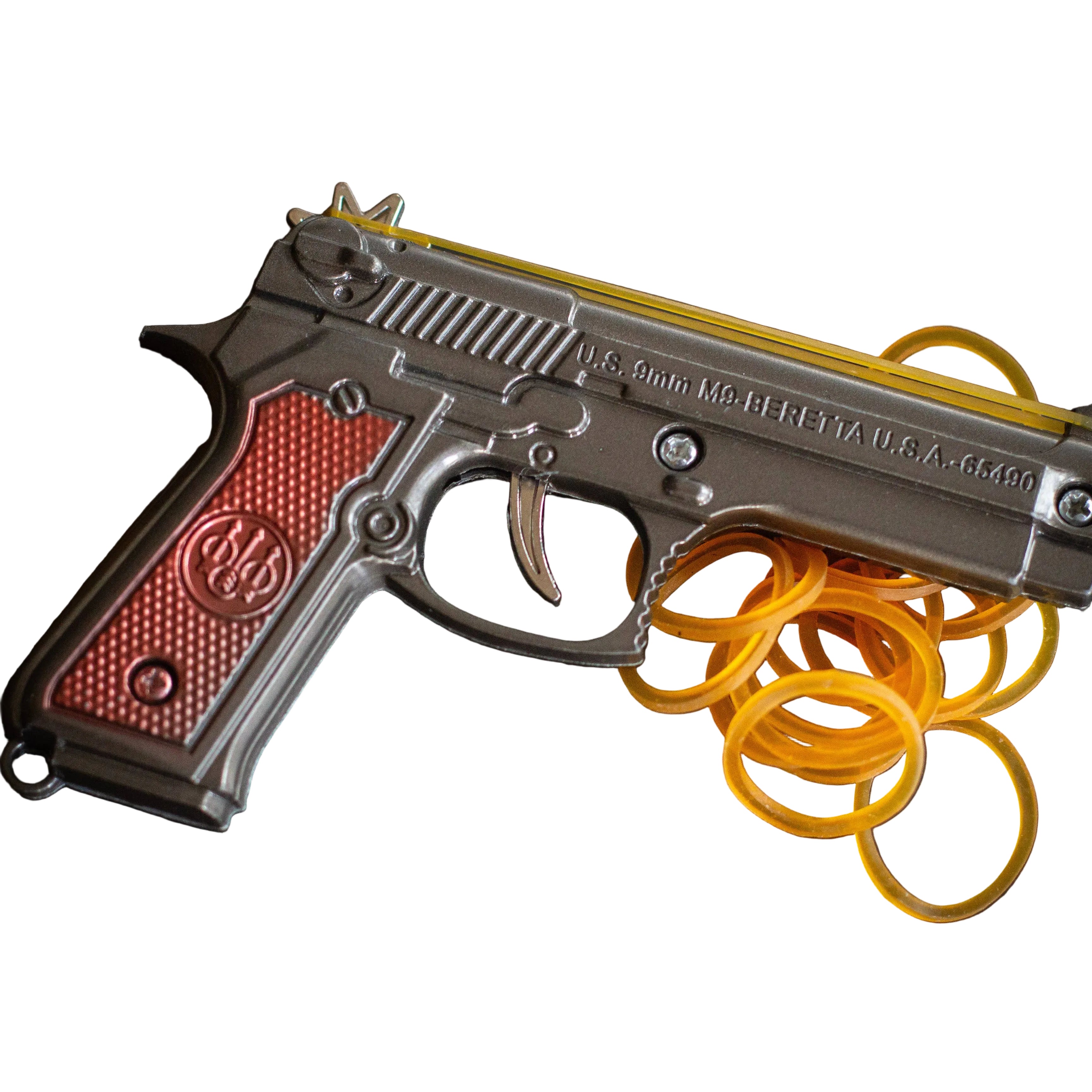 Perfect for playful battles and target practice, this rubber band shooter is a must-have for kids, gun collectors, military buffs, and collectors alike. Modeled after the Beretta M9, this metal rubber band gun boasts a sleek and durable construction. Each rubber band can reach distances of approximately 20 feet, ensuring plenty of fun and challenge.