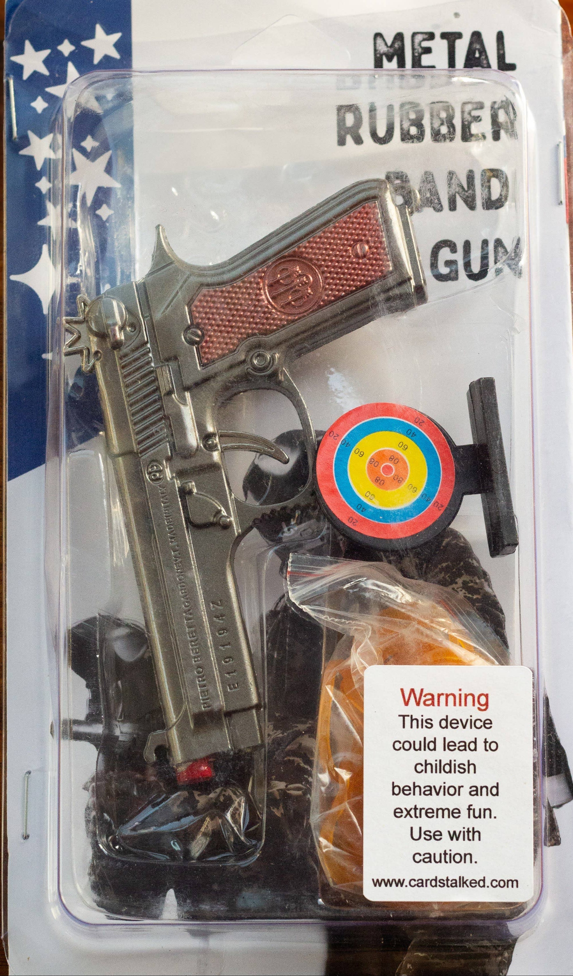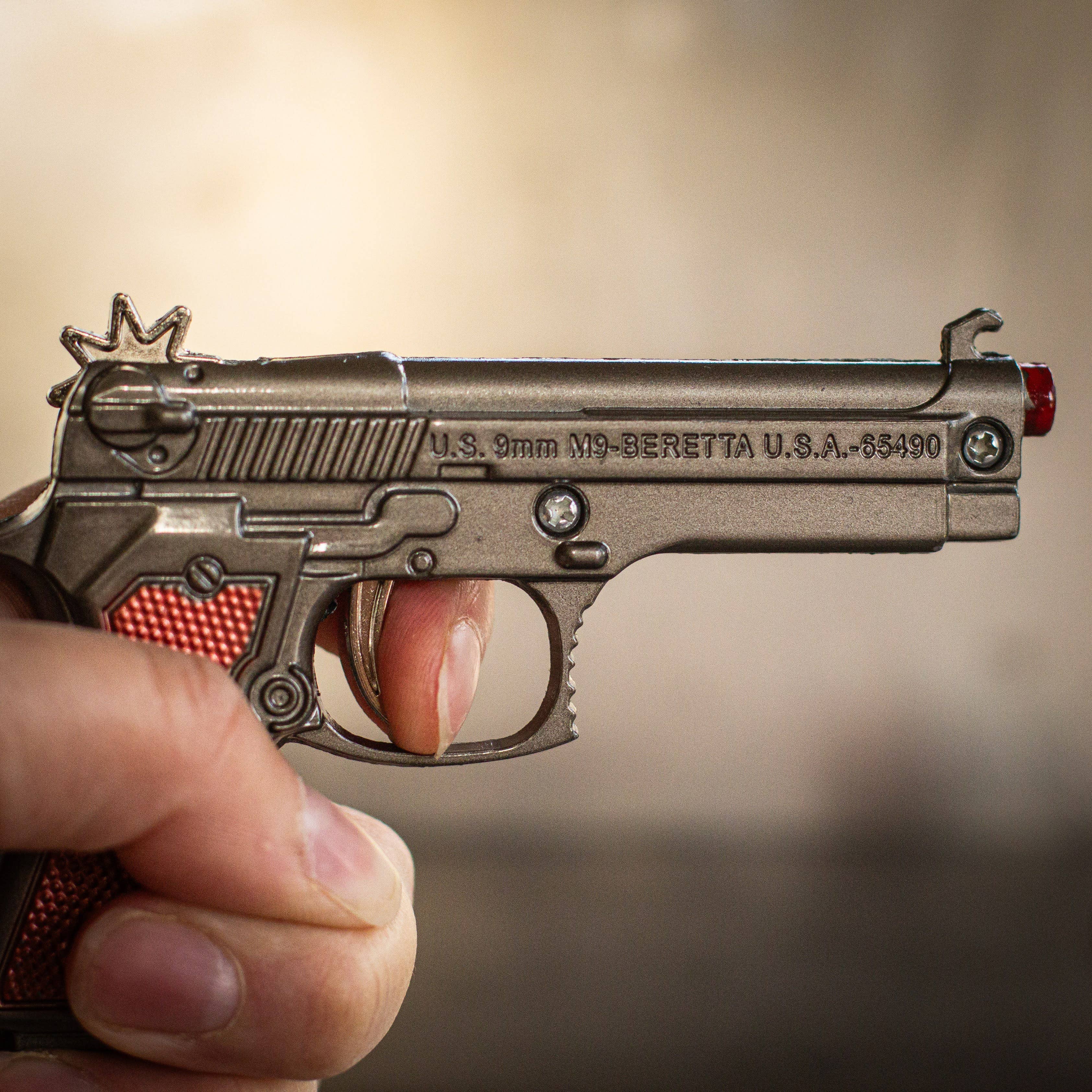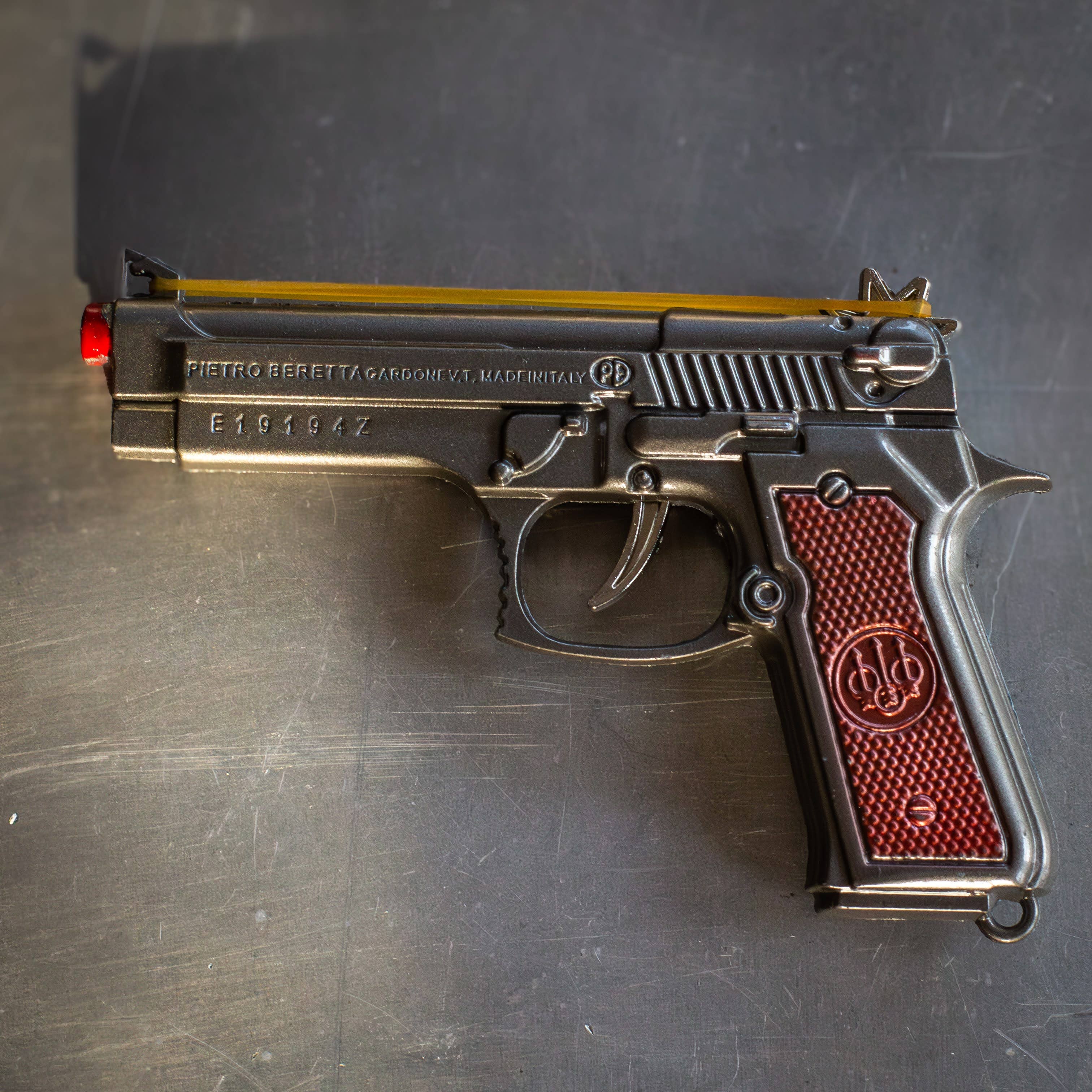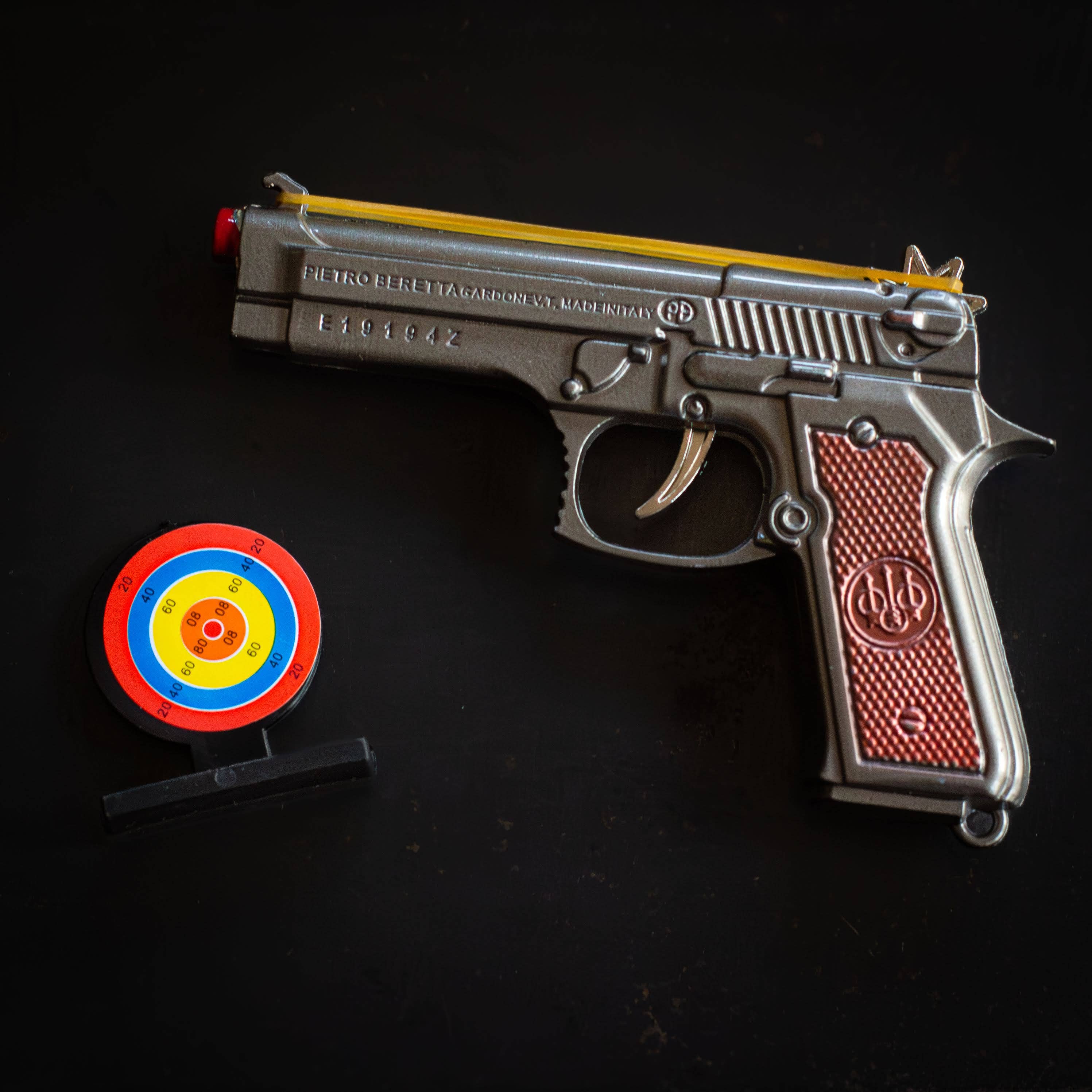 Perfect for playful battles and target practice, this rubber band shooter is a must-have for kids, gun collectors, military buffs, and collectors alike. Modeled after the Beretta M9, this metal rubber band gun boasts a sleek and durable construction. Each rubber band can reach distances of approximately 20 feet, ensuring plenty of fun and challenge.