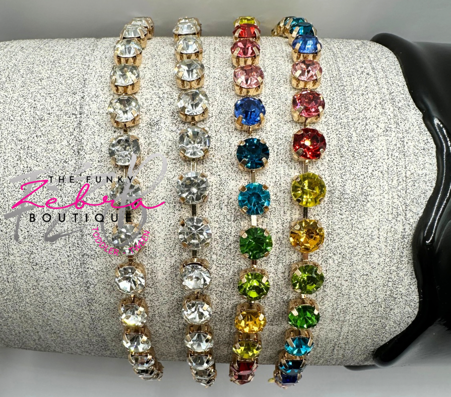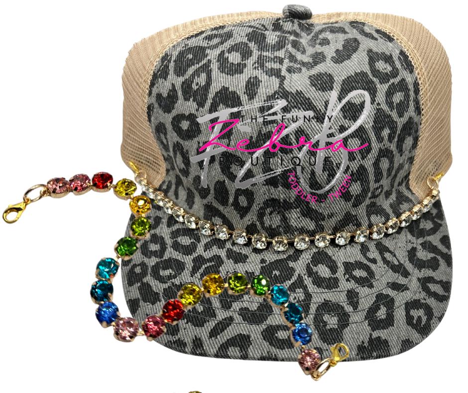 A distinctive way to enhance your favorite trucker hat with flair. This crystal rhinestone cup chain hat chain is a perfect accent for any hat. The chains are set in gold and come with matching gold lobster clasps for easy attachment to the hats mesh section.