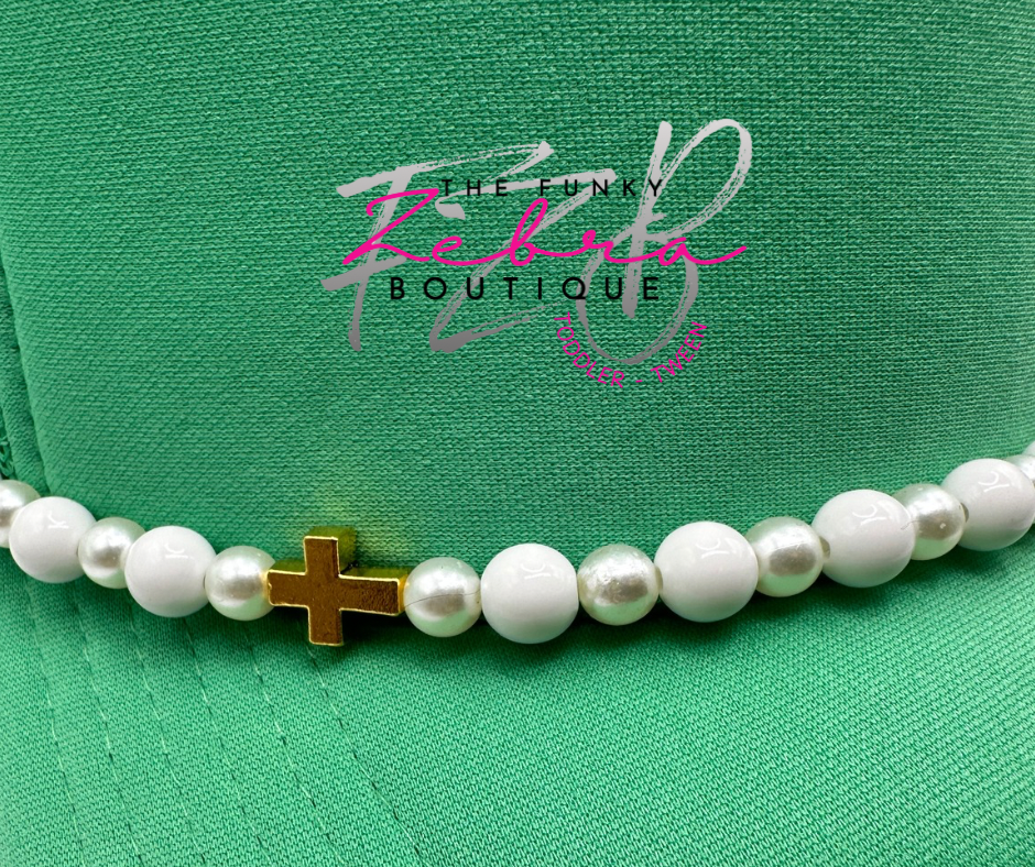 Hat Chain Faith Gold Cross Beaded Pearl Stretchy Hat Band