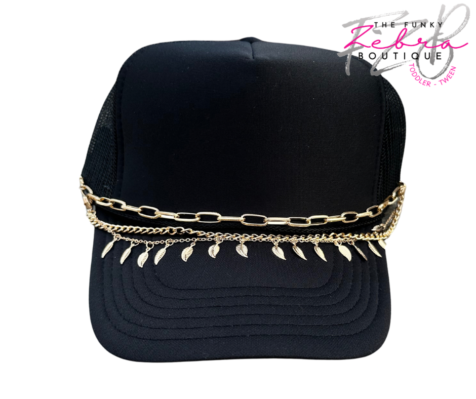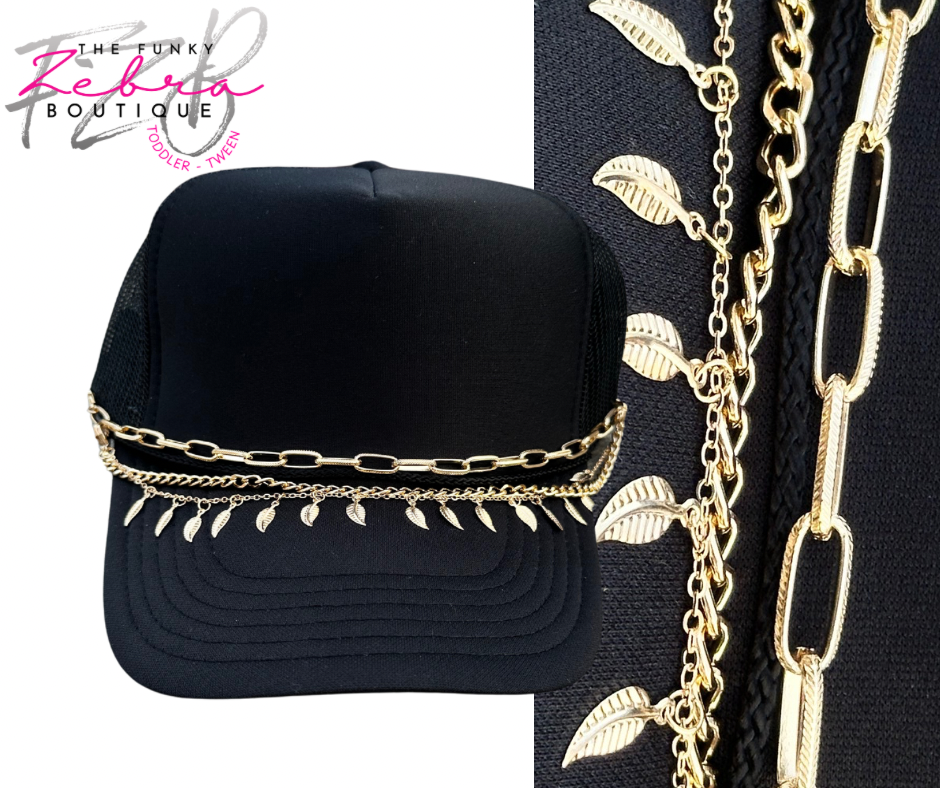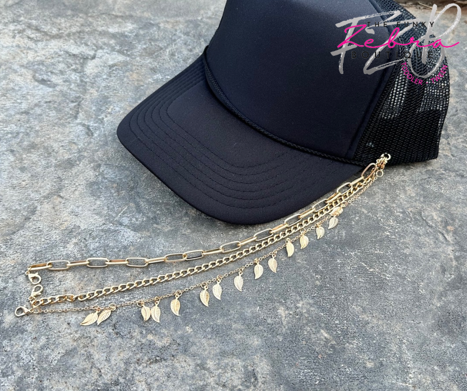 A distinctive way to enhance your favorite trucker hat with flair. These gold metal chains are a perfect accent for any hat. Mix the set of wear just one. The chains come with lobster clasps for easy attachment to the hats mesh section.