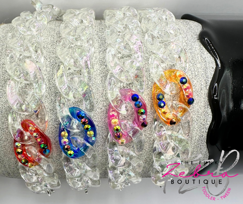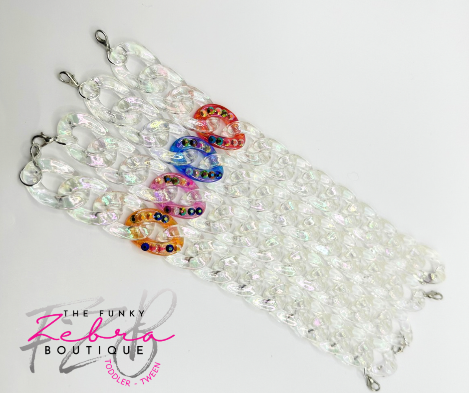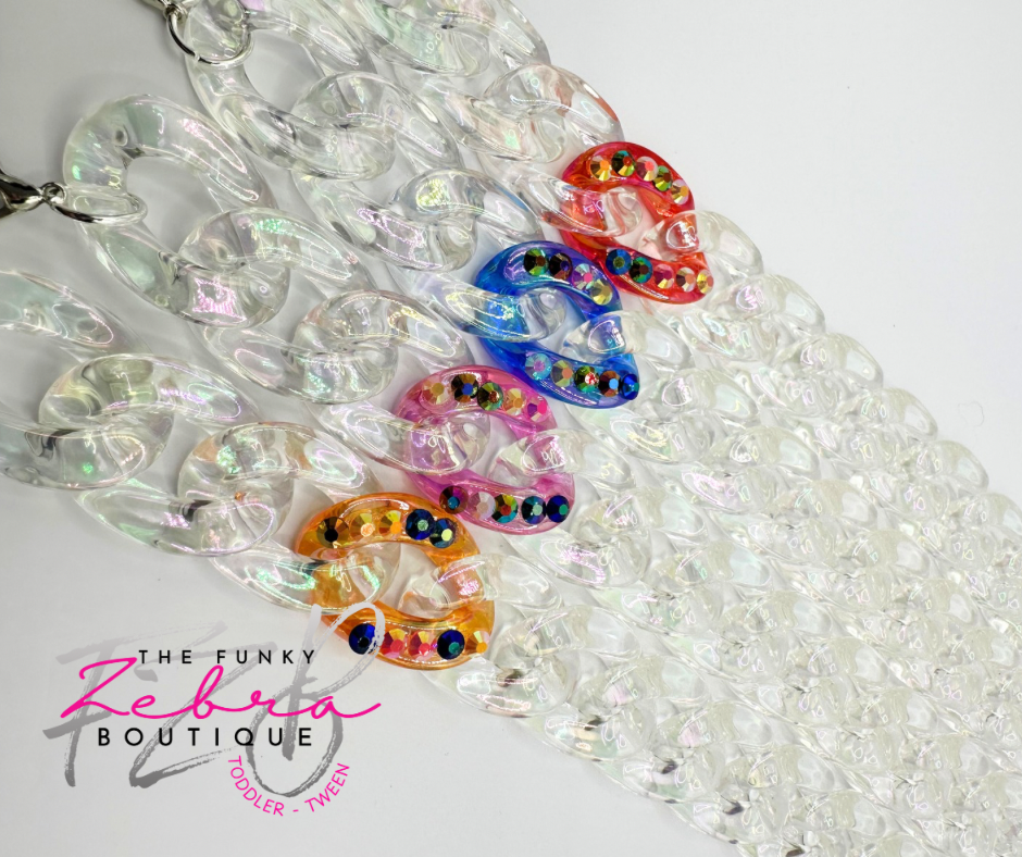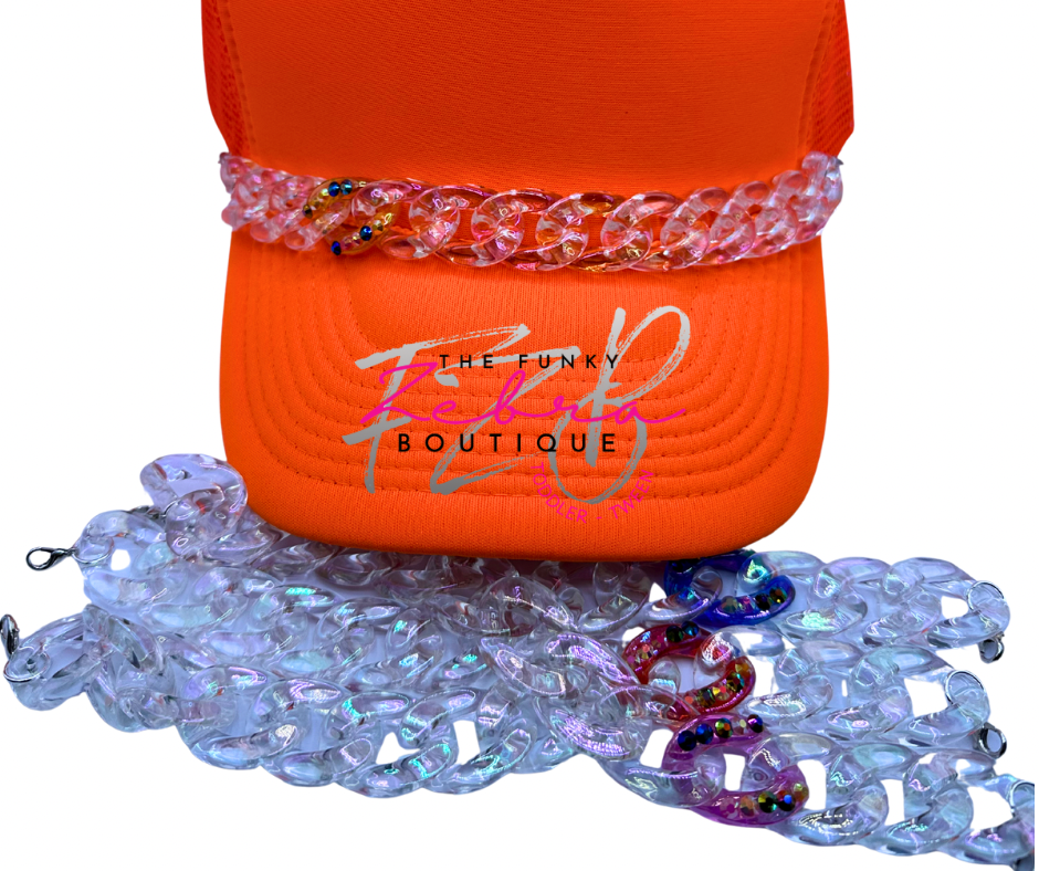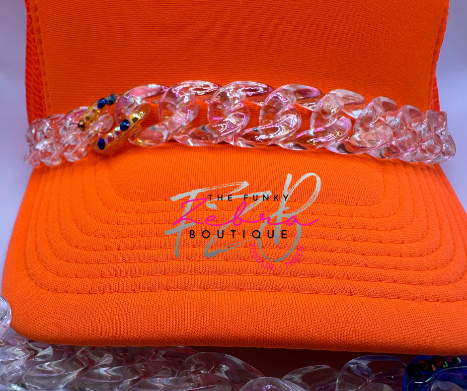 Clear iridescent linking beads that shimmer a rainbow of colors under the light. Paired with one colorful iridescent rhinestone linking bead to add some sass. A perfect accent for any hat. Each chain comes fully assembled with jump rings and lobster clasps for easy attachment to the hats mesh section.Β