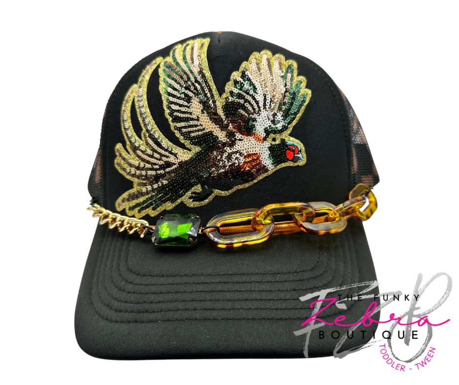 Adult Sequin Pheasant Brown Leopard Black Foam Designer Trucker Hat