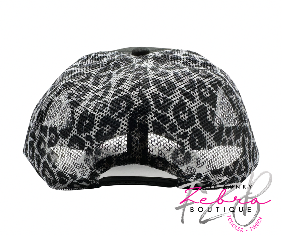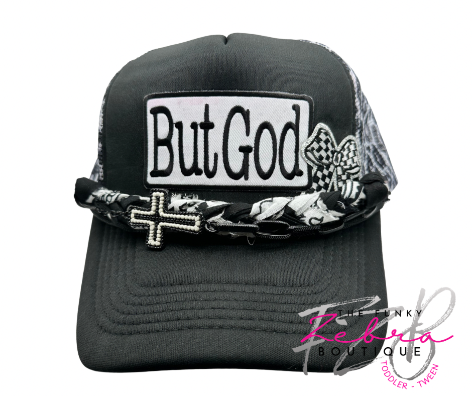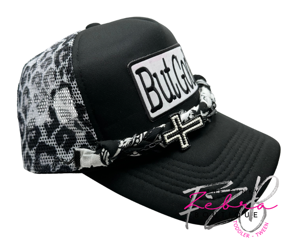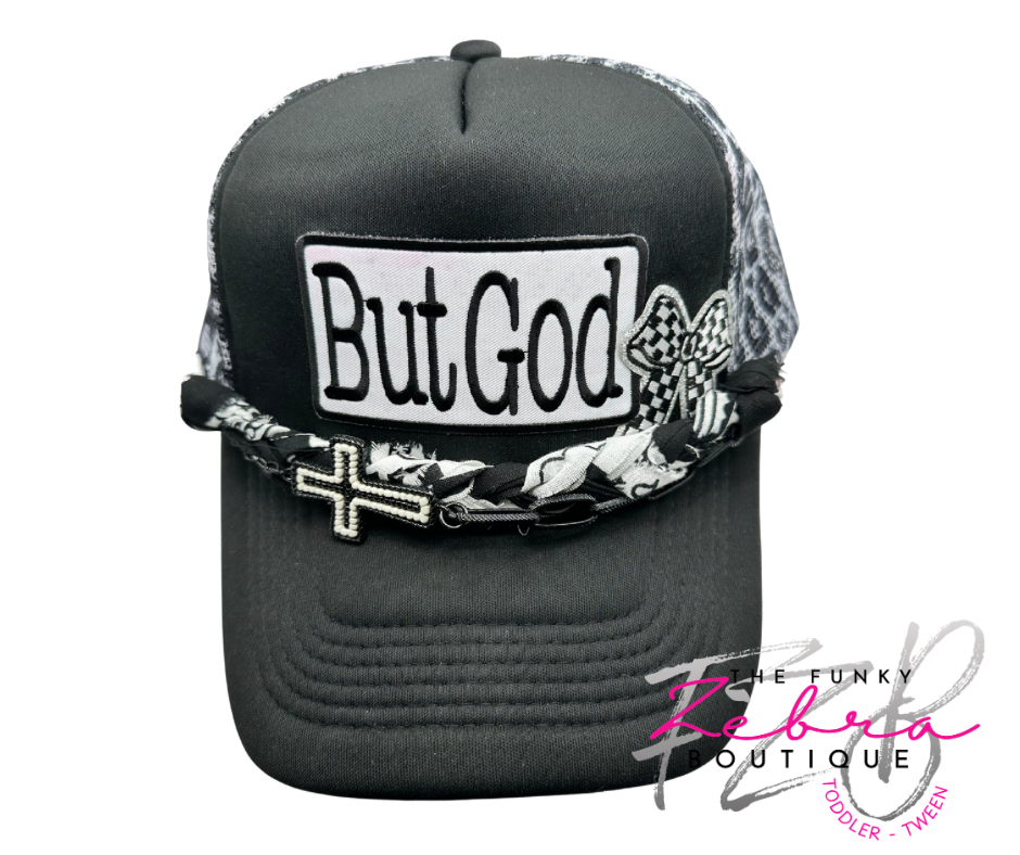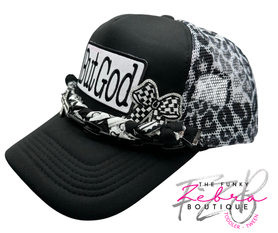 Designer black leopard foam front hat with embroidered But God patch and black and white checkered bow patch. Double hat chain. Braided black and white bandana layered with a black chain with white and black cross. All adorned on a designer brand Adult black foam front trucker hat with black and white leopard print mesh back and adjustable snap closure.