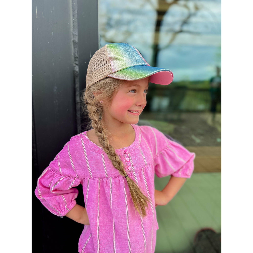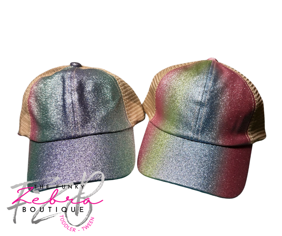 Our KIDS shimmer glitter ball cap in a new ombre pattern is sure to make your favorite little ones feel special, and with our most popular Criss-Cross back, it allows you to style your little one's hair at different levels to suit their personality!Β