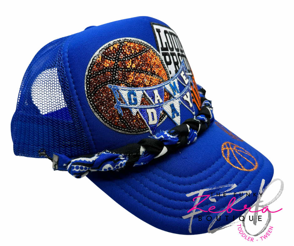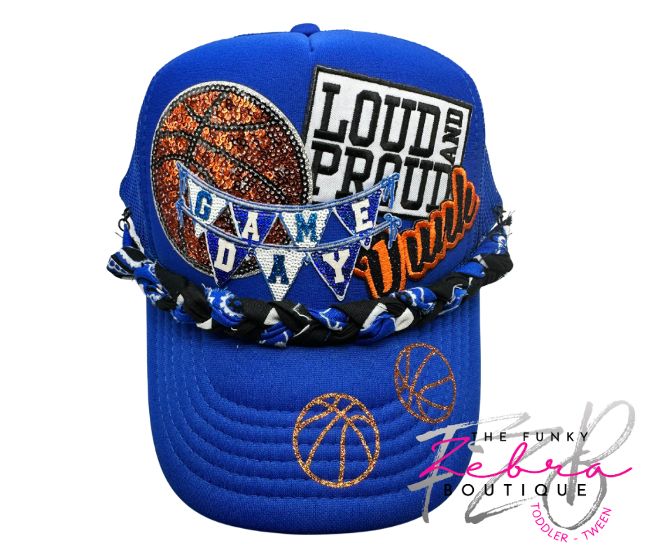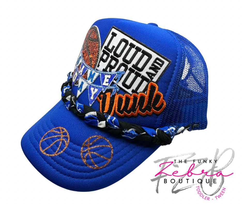 This sweet handmade foam trucker hat is the perfect way to cheer on your favorite basketball team. Adorned with an orange sequin basketball patch and royal blue and white glitter flag Game Day surrounded an embroidered Loud and Proud and Dunk patches. Two orange glitter vinyl basketballs on the bill and a braided bandana hat chain finish this hat off.Β All adorned on an OTTO brand Adult royal blue foam front trucker hat with mesh back and adjustable snap closure.