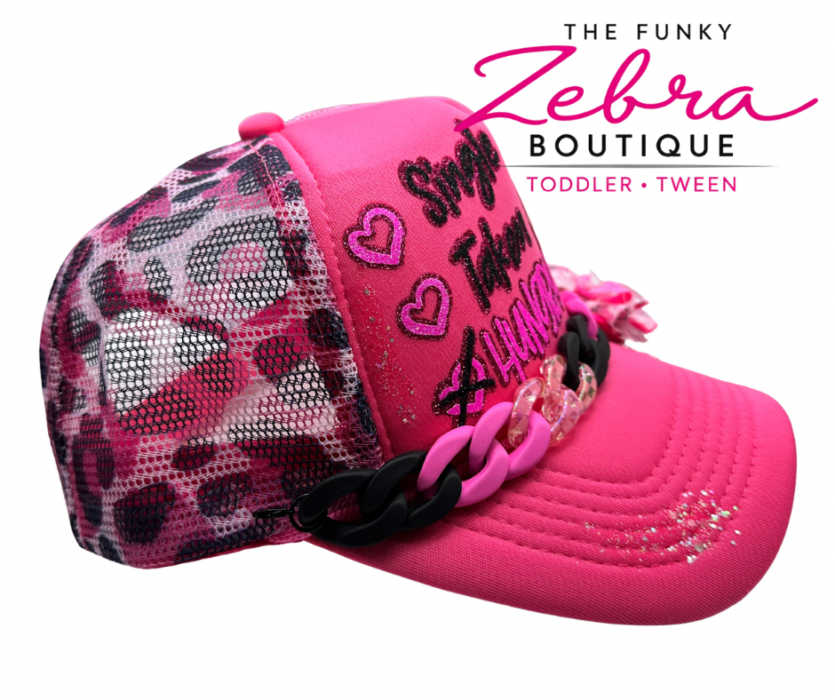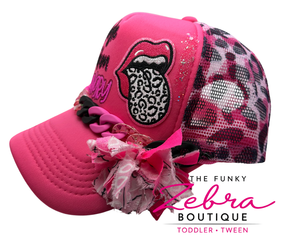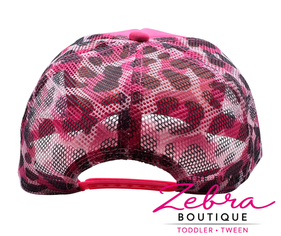 All adorned on a designer brand hot pink foam front with pink and black leopard print mesh back trucker hat with adjustable snap closure. This hat is OSFM (one size fits most) adult size.