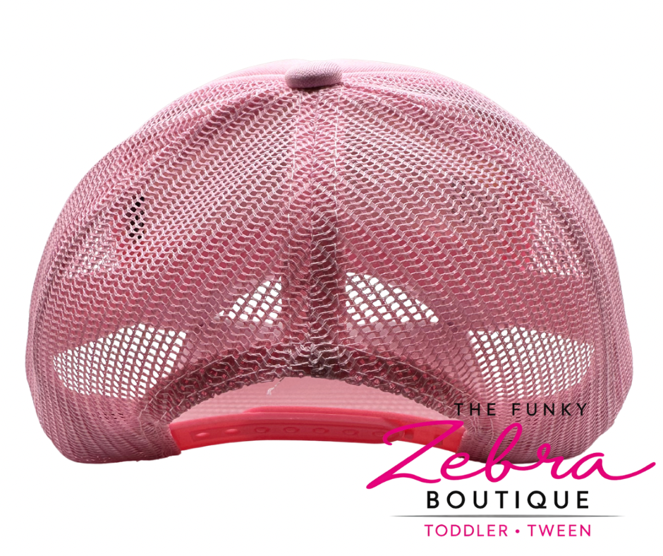 All adorned on a Decky brand light pink foam front with mesh back trucker hat with adjustable snap closure. This hat is KIDS size and fits ages 3T through 7/8 best in my opinion.