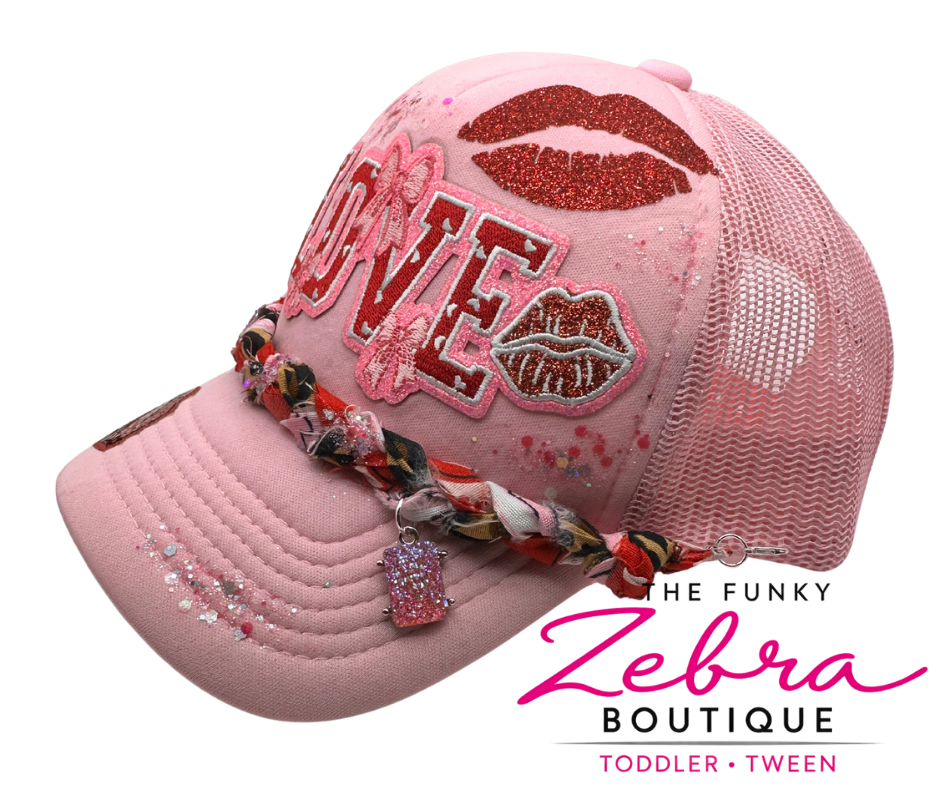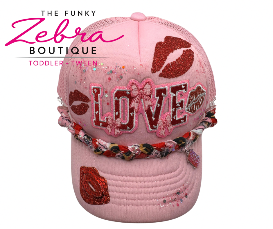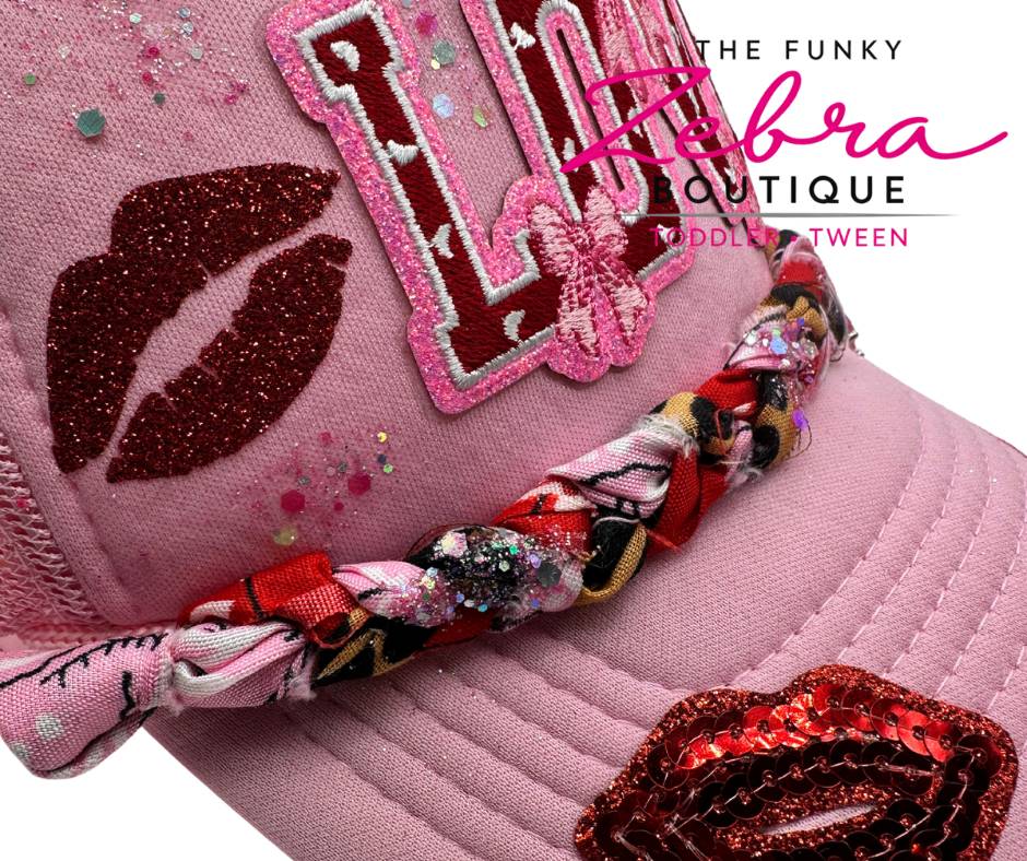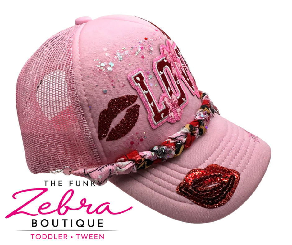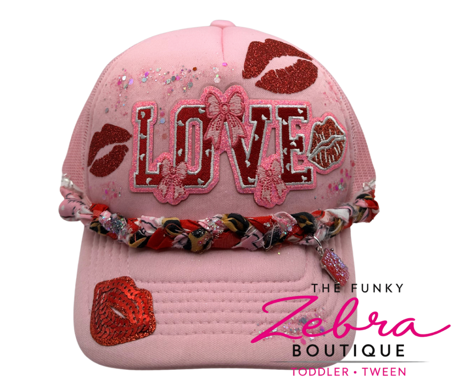 This handmade foam trucker patch hat features and embroidered designer Love patch surrounded with red glitter vinyl lips and glitter. A sequin red lips patch adorns the bill. A braided bandana hat band with frosted pink charm adds that special pop.Β