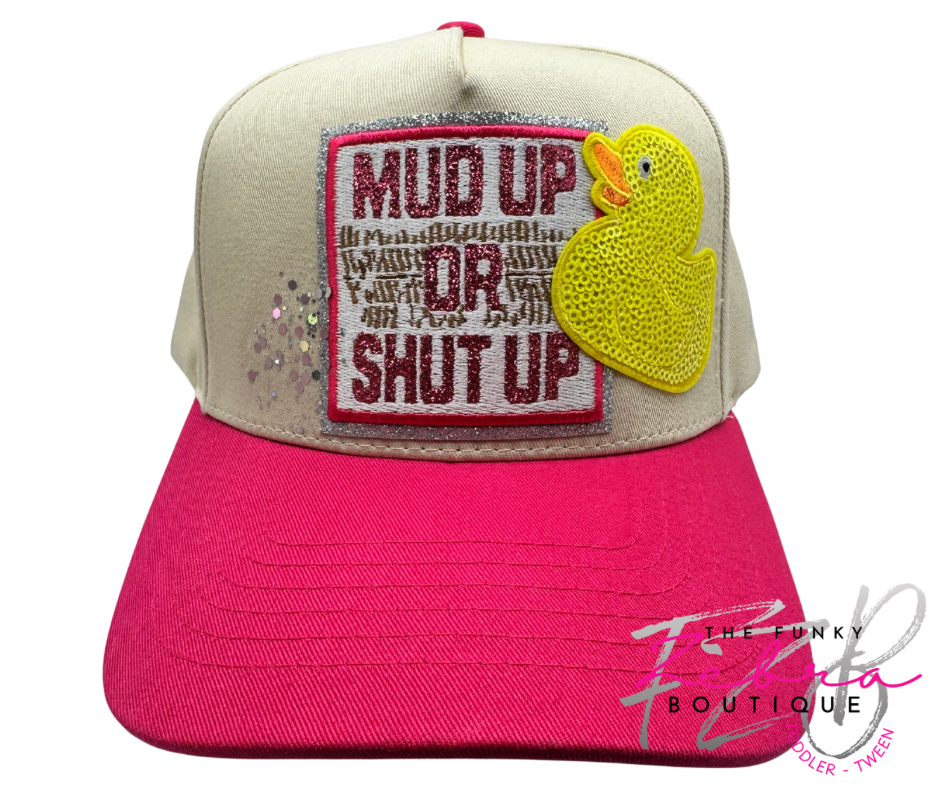 Adult Mud Up or Shut Up Yellow Duck Motorsports Racing Side By Side Canvas Pink Patch Baseball Hat - Fits Youth - Adult