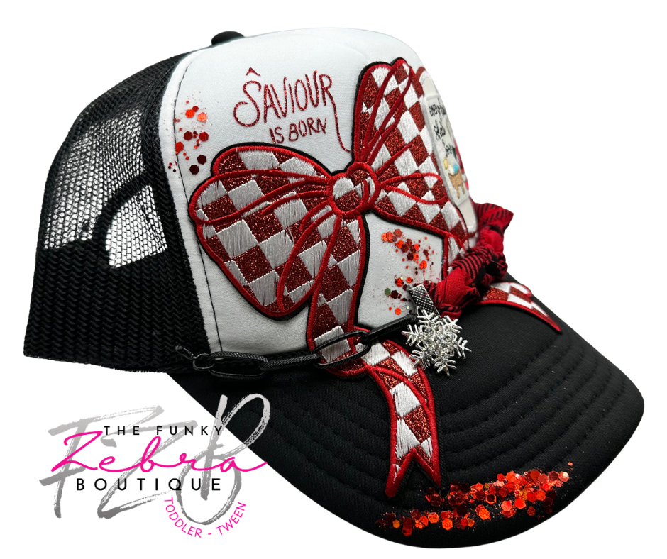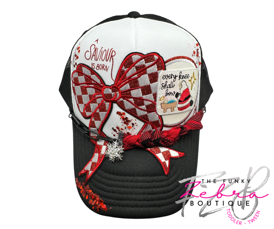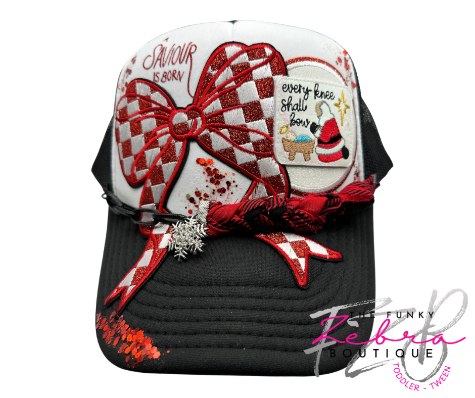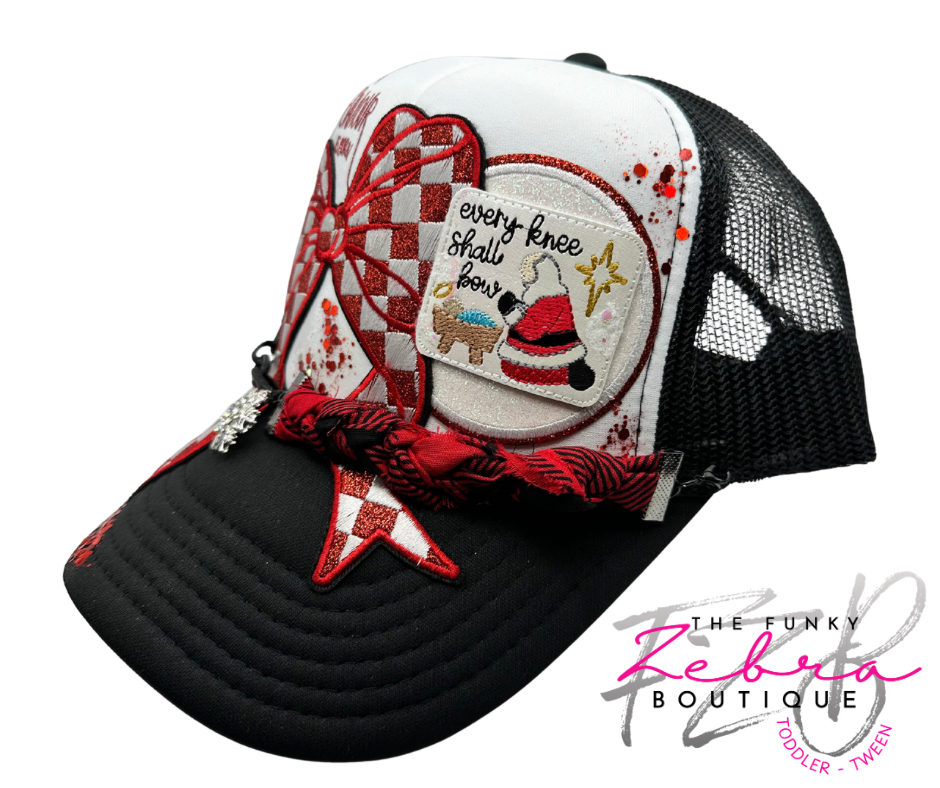 Every Knee Shall Bow Santa Kneeling at Baby Jesus in the manger foam trucker hat.