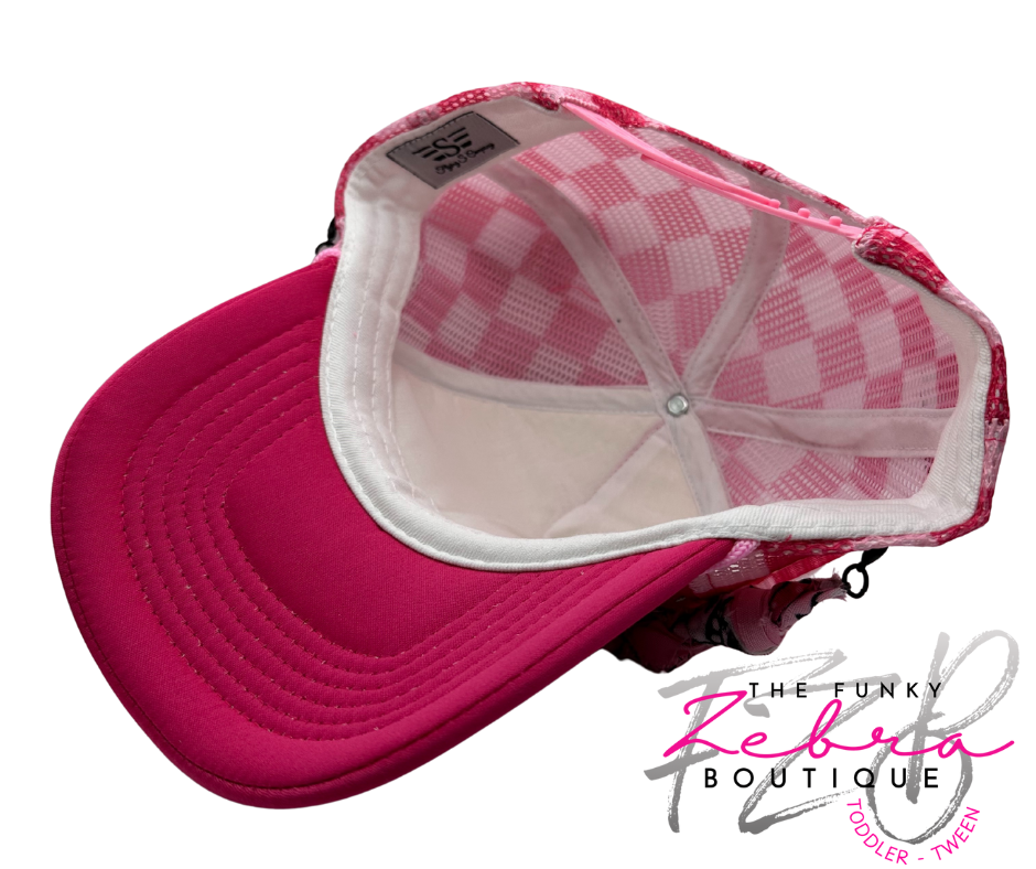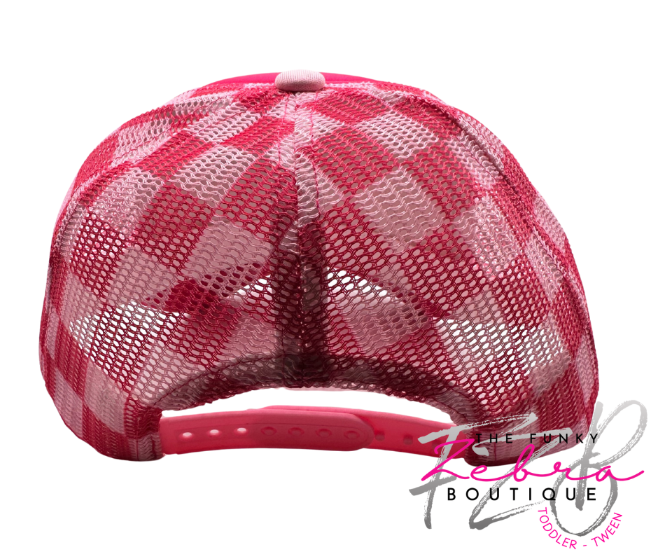 All adorned on a Flying S Co brand kids pink checkered mesh back hot pink foam trucker hat with adjustable snap closure. This hat fits ages 3T-7/8 best