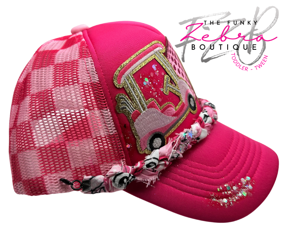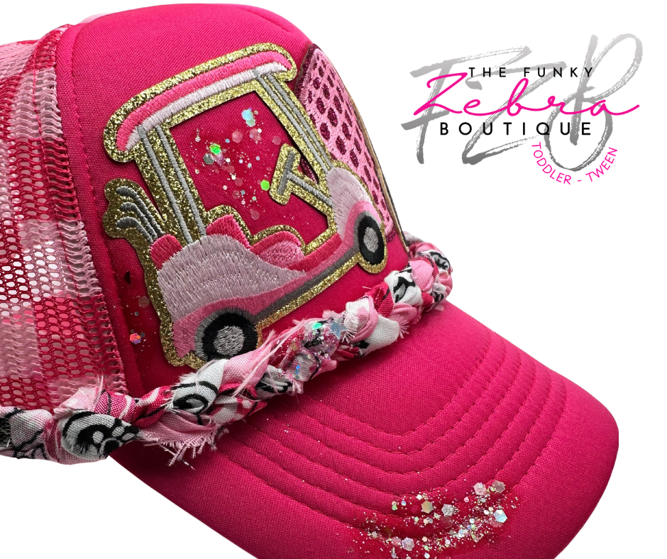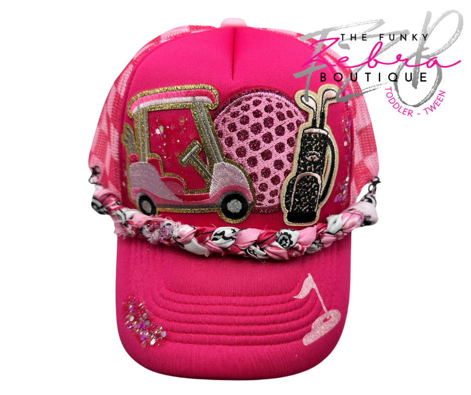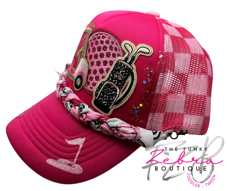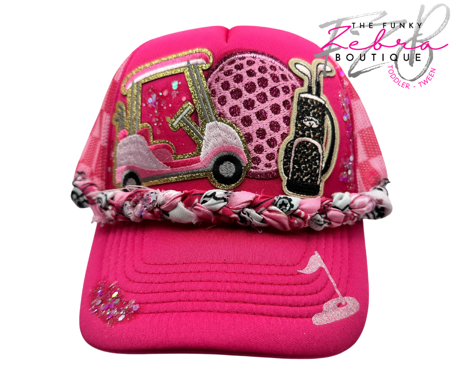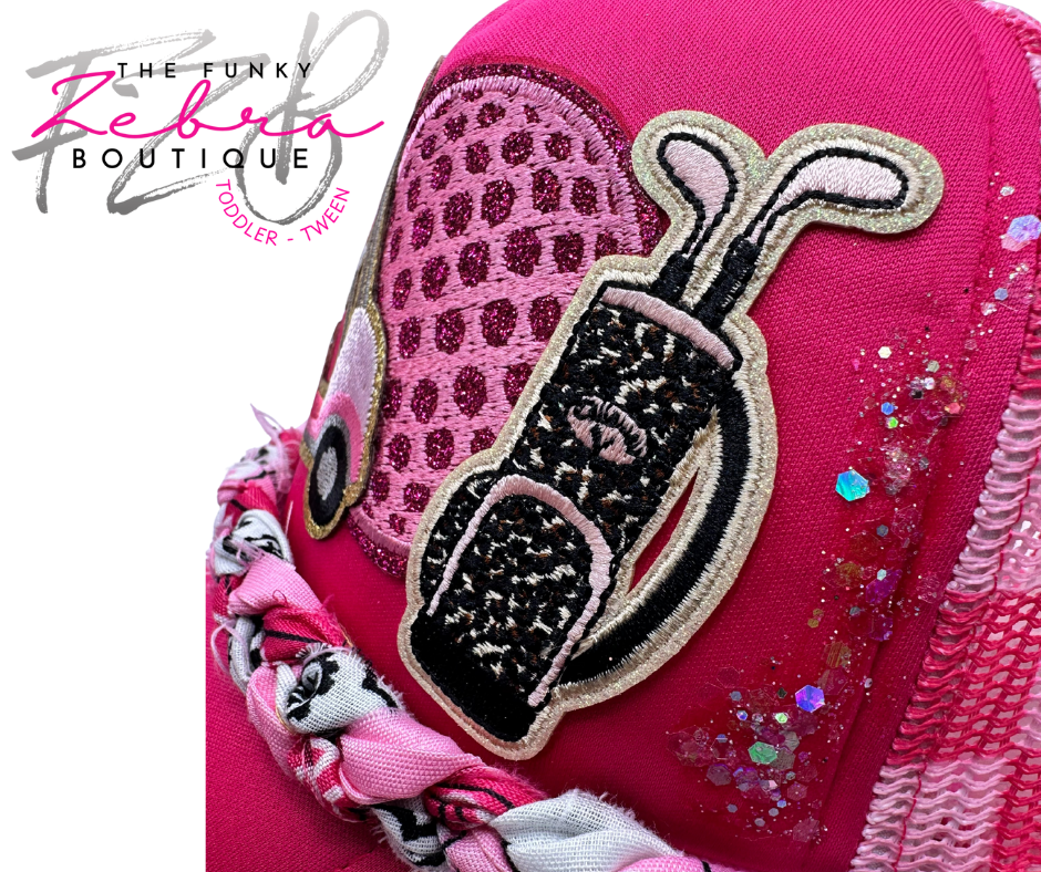 This handmade foam trucker patch hat features a trio of embroidered patches including a glitter gold outline golf cart, dark pink glitter golf ball and leopard print golf clubs and bag. Candy Pink glitter surrounds it all. A braided bandana hat chain adds that special pop.