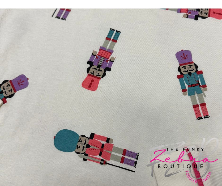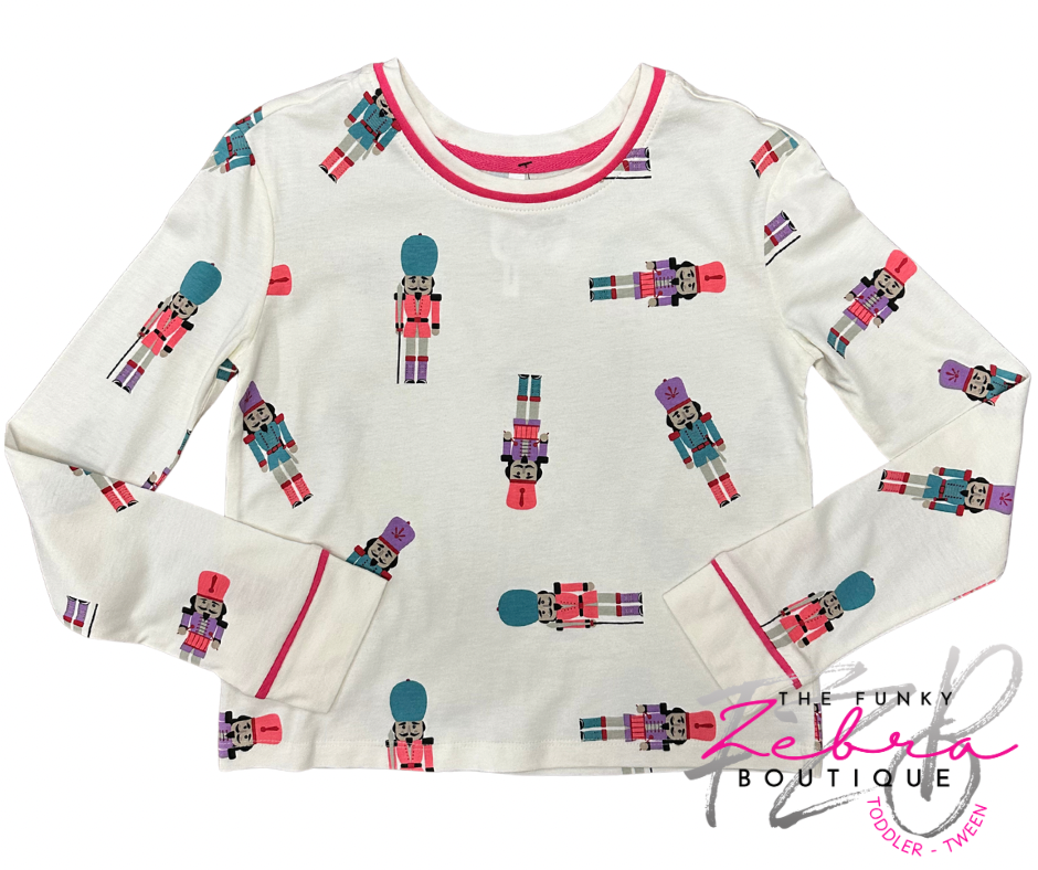 Long sleeve ivory tee shirt with colorful nutcracker printed material. Hot pink pink accent stripes on the collar and cuffs. 52% cotton, 48% modal