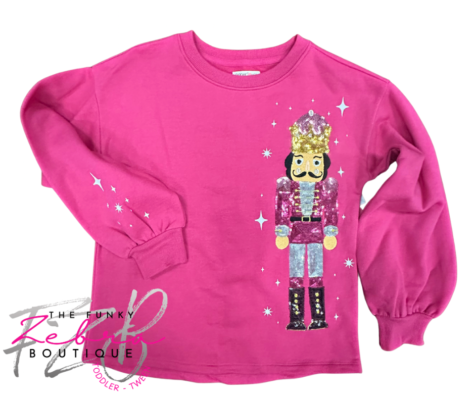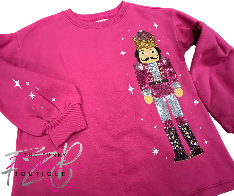 Gorgeous sequin nutcracker embroidered on a fun berry pink sweatshirt. White screen printed stars splash around the nutcracker and right sleeve.