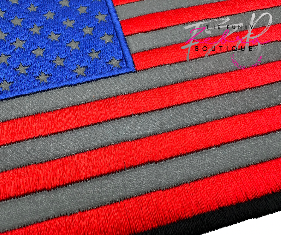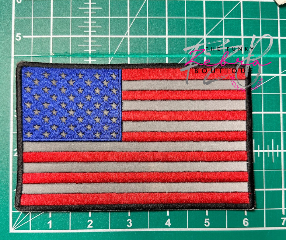 Featuring a heat- sealed backing. This means that the patch may be ironed on or sewn on to most clothing easily. Red and blue thread, black outline and grey reflective material. This is a very large patch and would be best for a large bag or the back of a jacket.