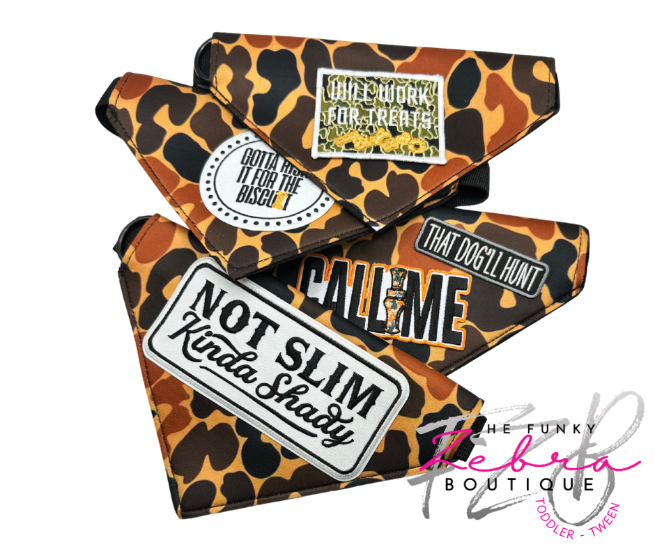 Brown Orange Camo Camouflage Neoprene Designer Dog Bandana Collar - Pick Your Patch Style