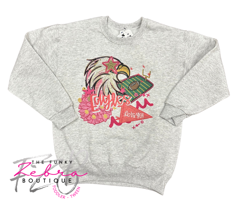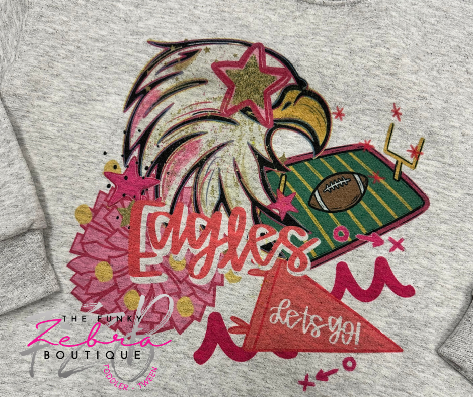 The cutest preppy mascot football sweatshirts for our Eagle fans! Sublimation print on an ash sweatshirt. This design is not specific to one town so it is perfect for any Eagle mascot.