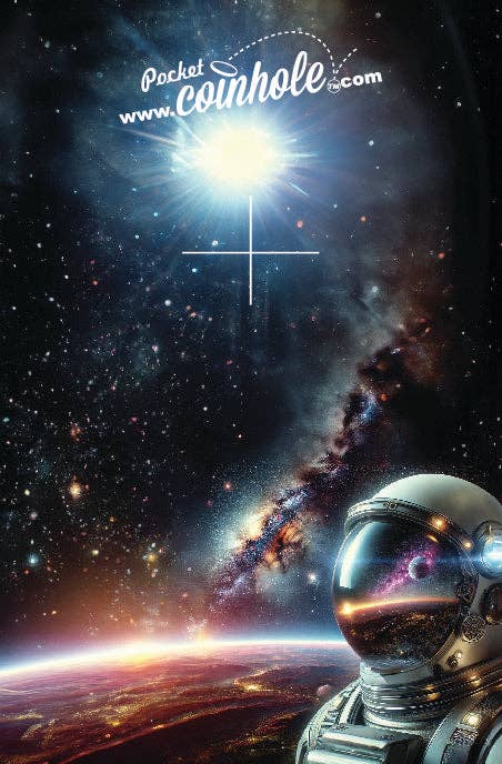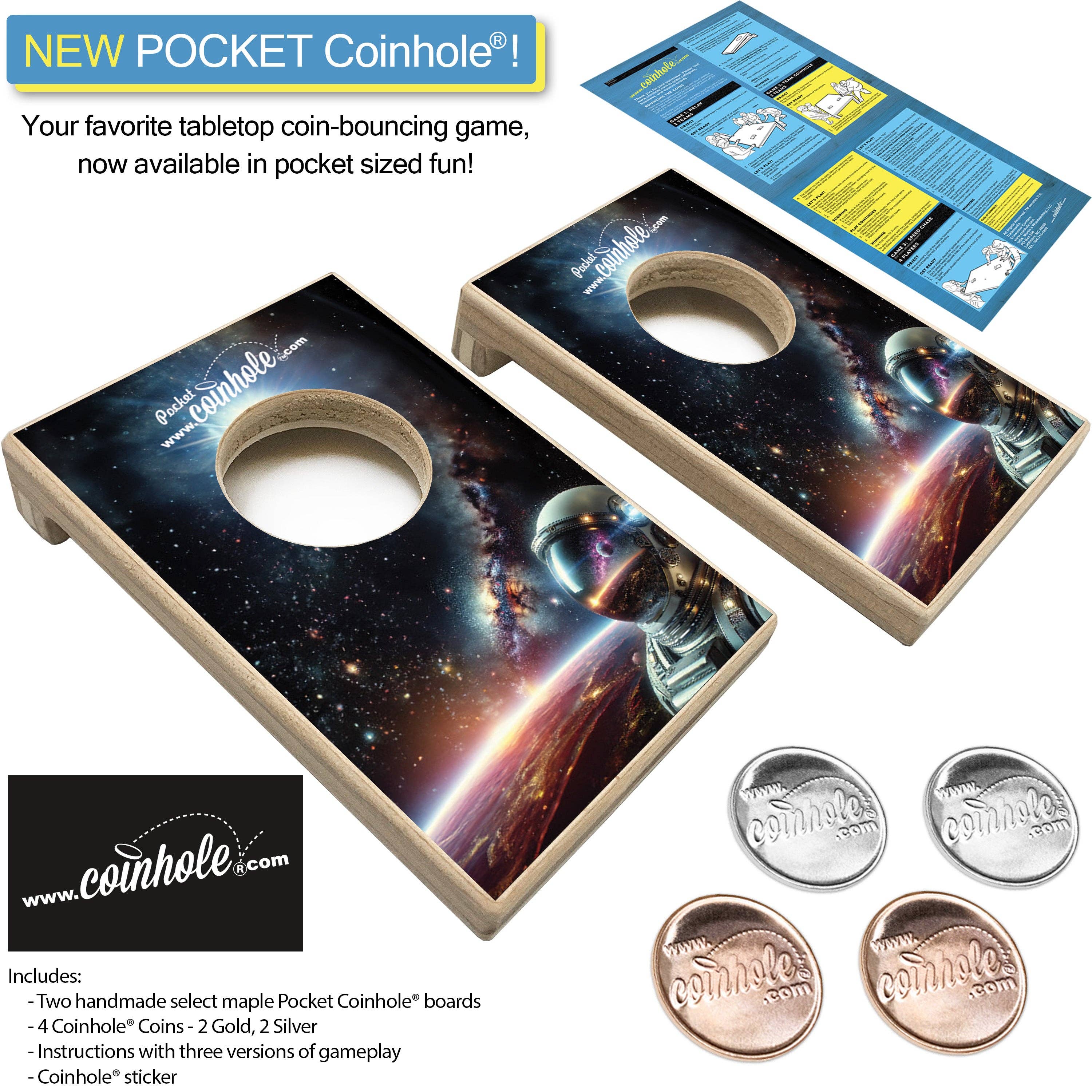 NEW POCKET Coinhole®! Your favorite tabletop coin-bouncing game, now available in pocket sized fun! Enjoy a game of POCKET Coinhole® on this handmade reach for the stars space man moon man Coinhole® boards. POCKET Coinhole® is the perfect gift for the whole family.
