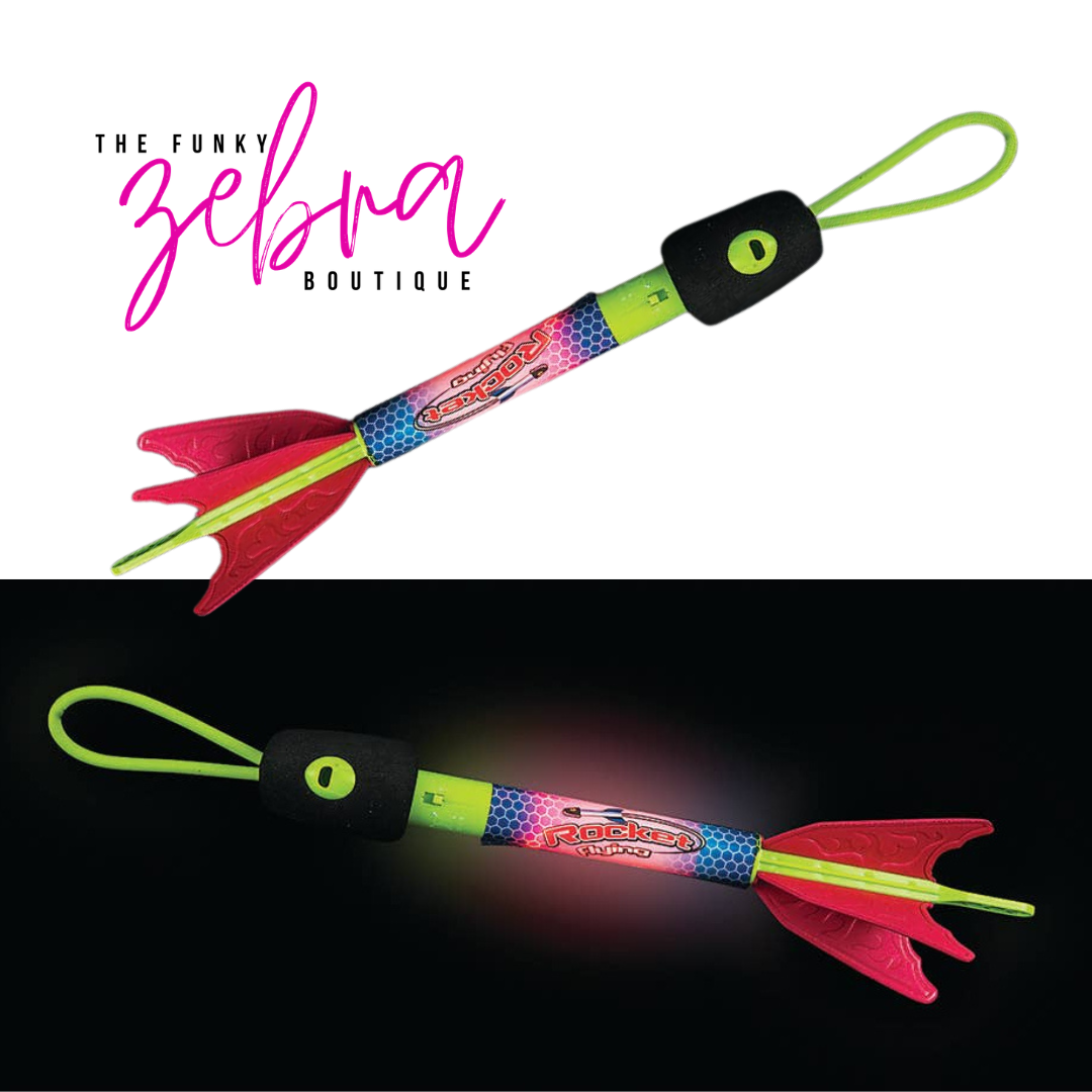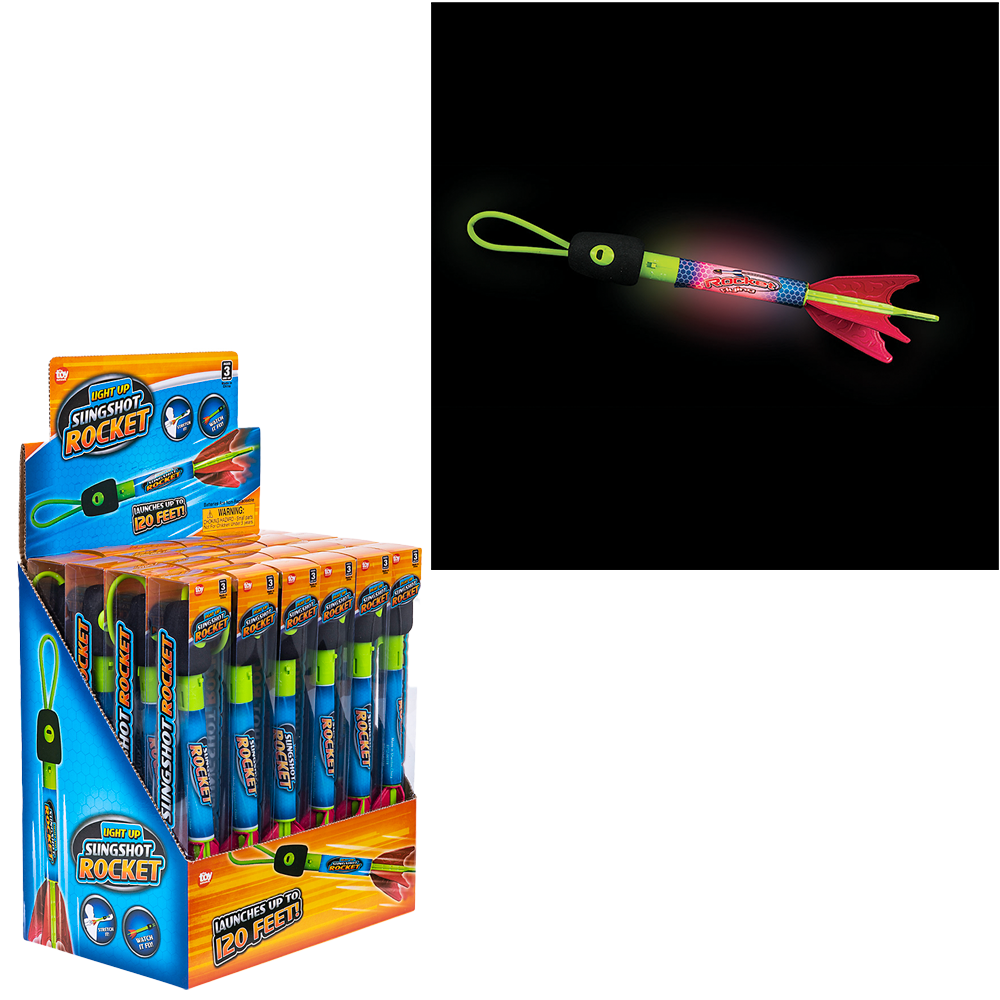 These slingshot rockets will light up your counter display. Everyone will want one of these foam rockets that whistle through the air. Each piece is sold in a PVC box. Each rocket includes two AG3 batteries that allow the rocket to light up.