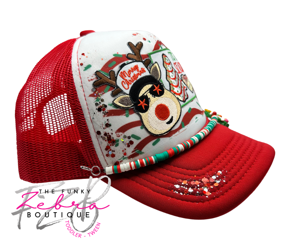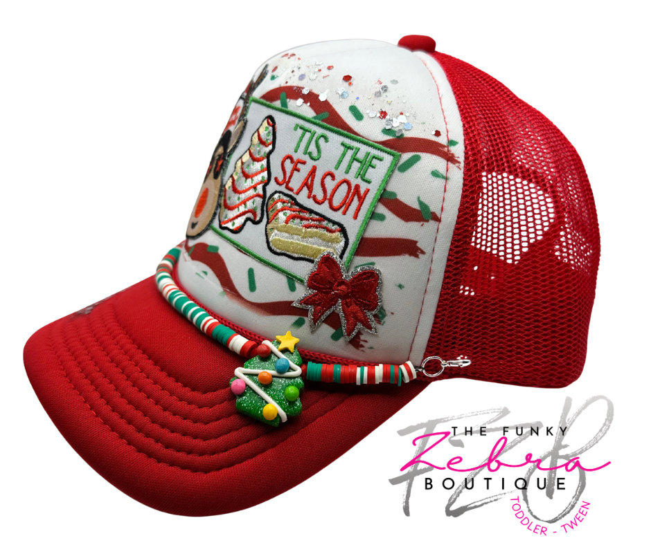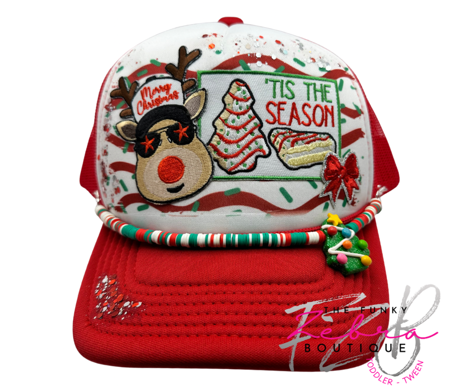 Tis The Season Snack Cake Rudolf theme foam trucker hat.