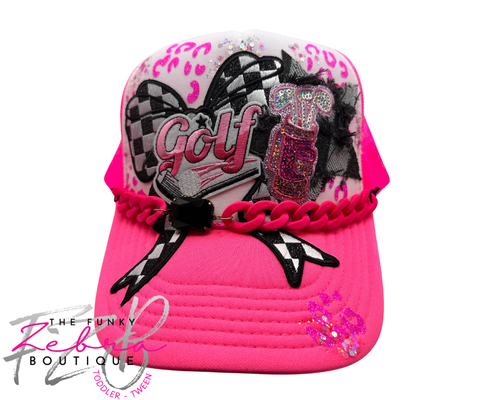 Adult Golf Neon Pink and Black Checkered Bow Foam Front Trucker Hat